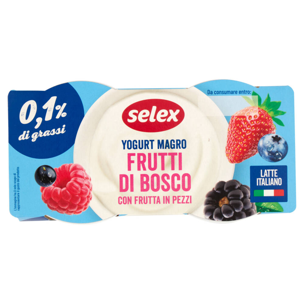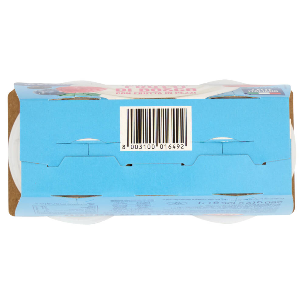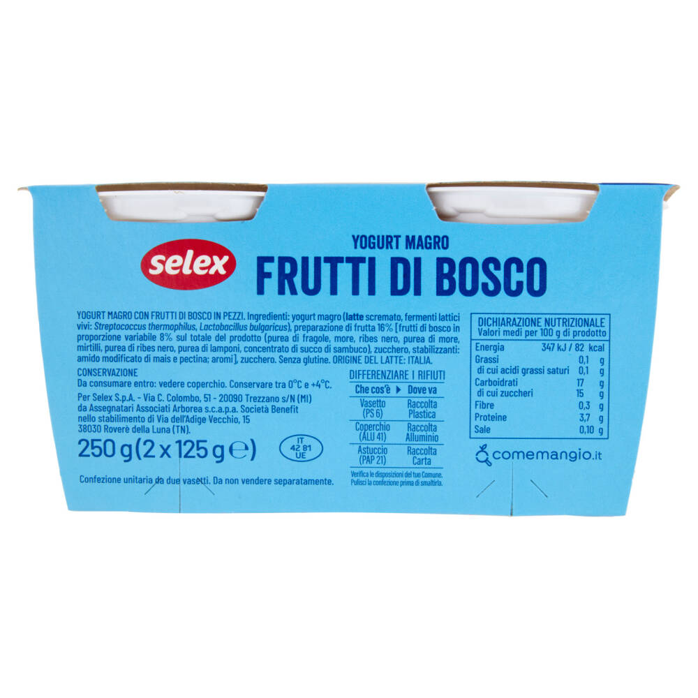 Yogurt magro (latte scremato, fermenti lattici vivi: Streptococcus thermophilus, Lactobacillus bulgaricus) Preparazione di frutta 16% [frutti di bosco in proporzione variabile 8% sul totale del prodotto (purea di fragole, more, ribes nero, purea di more, mirtilli, purea di ribes nero, purea di lamponi, concentrato di succo di sambuco), zucchero, stabilizzanti: amido modificato di mais e pectina; aromi] Zucchero Senza glutine