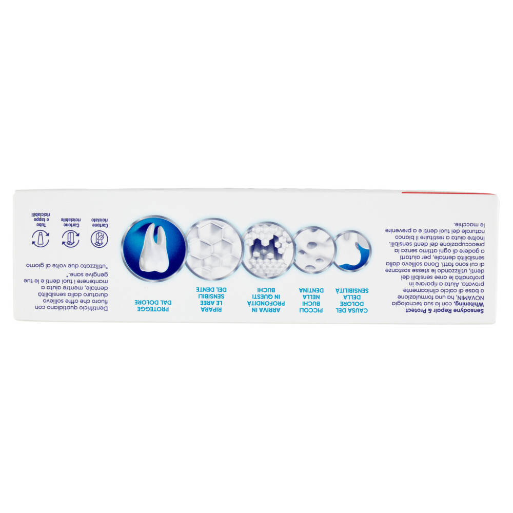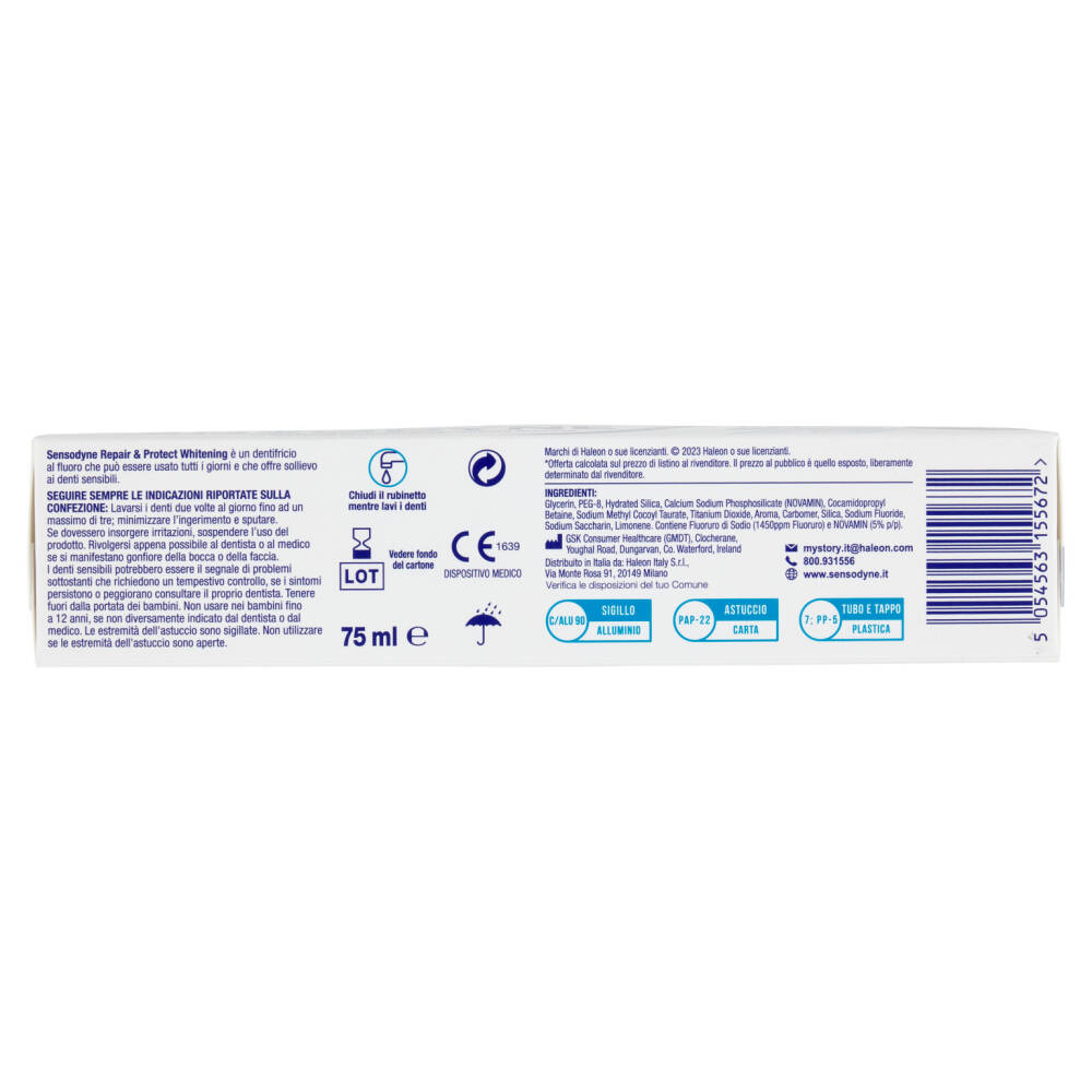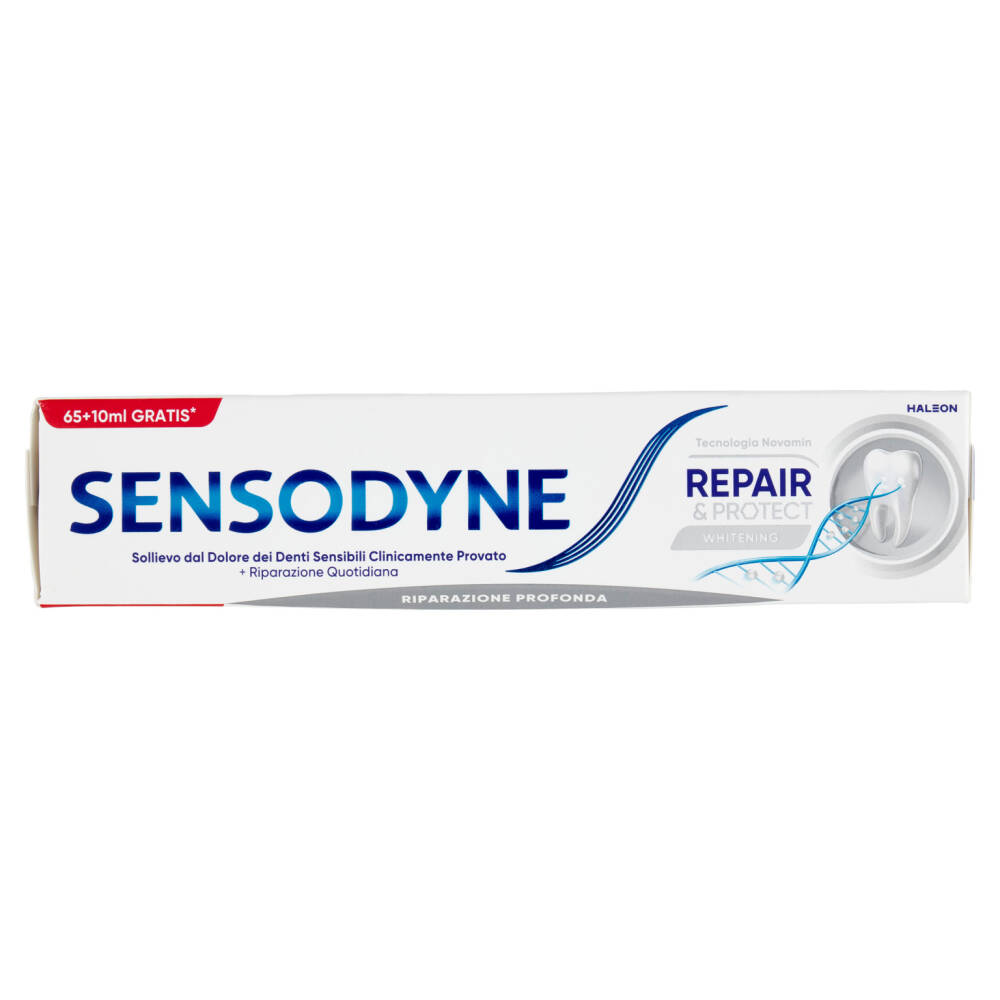 Sensodyne Repair & Protect Whitening, con la sua tecnologia Novamin, ha una formulazione a base di calcio clinicamente provata. Aiuta a riparare in profondità le aree sensibili dei denti, utilizzando le stesse sostanze di cui sono fatti. Dona sollievo dalla sensibilità dentale, per aiutarti a godere di ogni attimo senza la preoccupazione dei denti sensibili. Inoltre aiuta a restituire il bianco naturale dei tuoi denti e a prevenire le macchie.