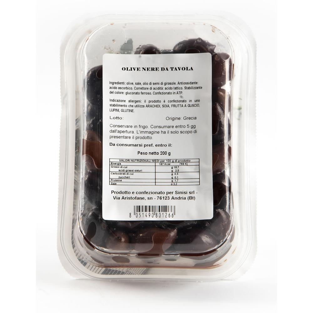 Ingredienti: Olive, sale, olio di semi di girasole. Correttore di acidità: acido lattico E270. Antiossidante: acido ascorbico E300. Stabilizzante del colore: Gluconato ferroso E579. Confezionato in atmosfera protettiva.