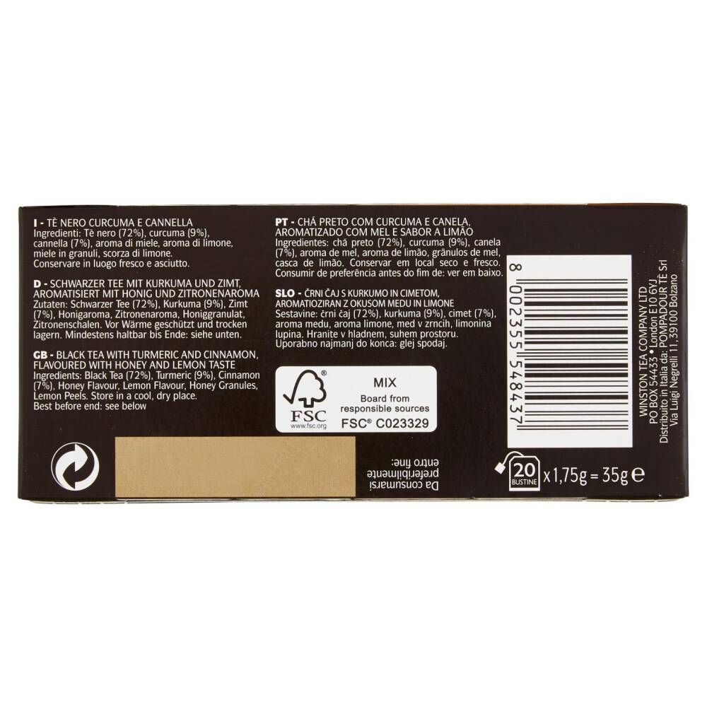 Tè nero (72%) Curcuma (9%) Cannella (7%) Aroma di miele Aroma di limone Miele in granuli Scorza di limone