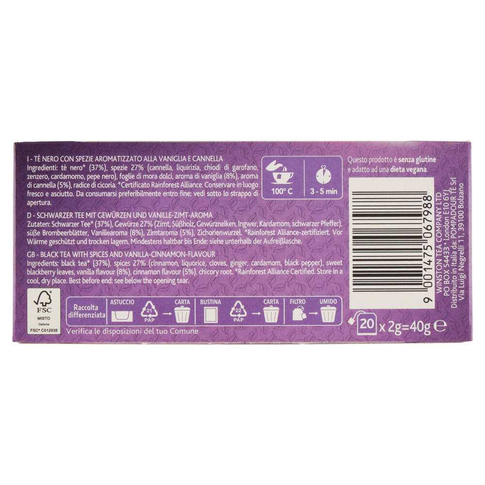 Tè nero* (37%) Spezie 27% (cannella, liquirizia, chiodi di garofano, zenzero, cardamomo, pepe nero) Foglie di mora dolci Aroma di vaniglia (8%) Aroma di cannella (5%) Radice di cicoria *Certificato Rainforest Alliance