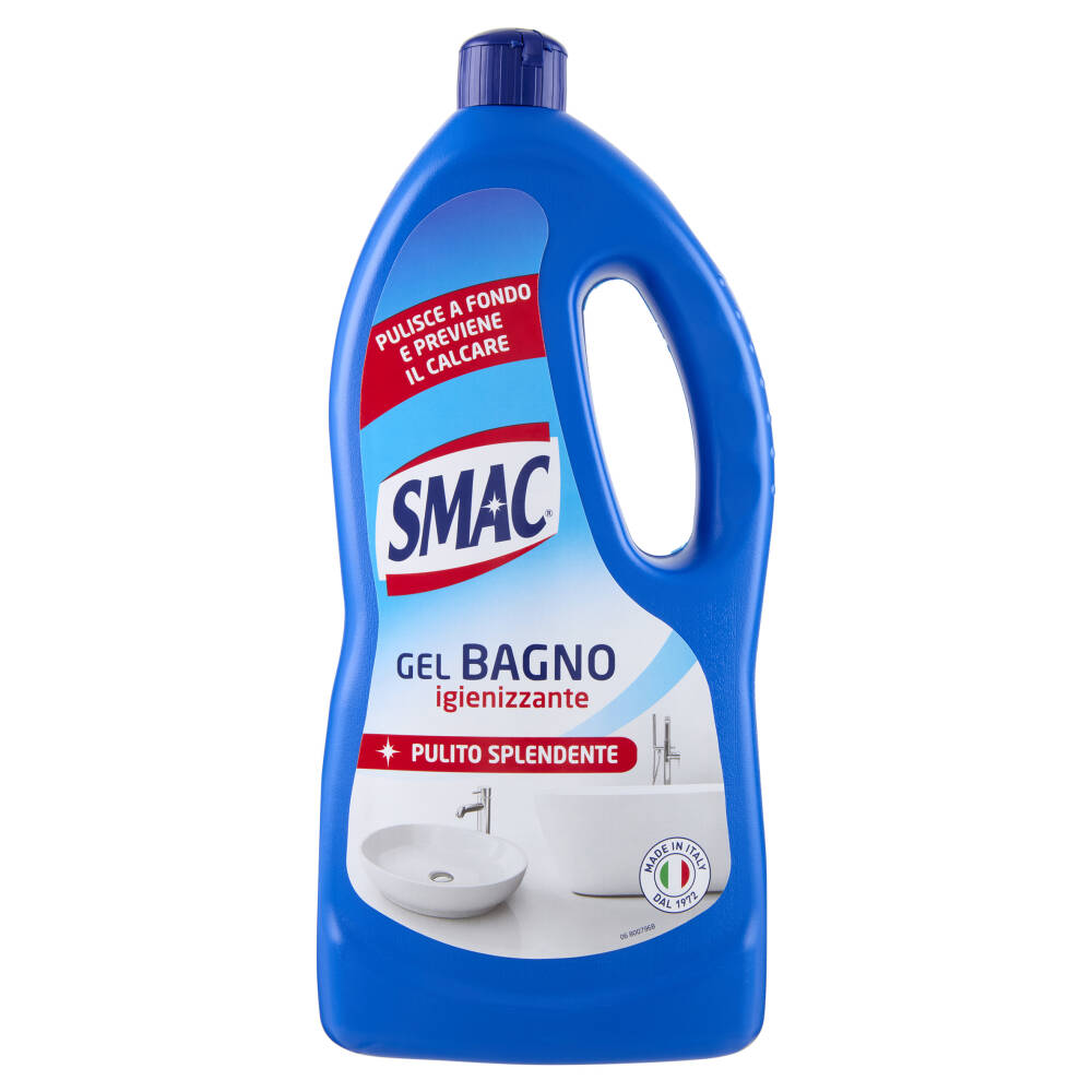 Smac gel Bagno pulisce a fondo, igienizzando le superfici e rimuovendo efficacemente tracce di calcare, macchie d'acqua e residui di sapone. Inoltre, la sua barriera protettiva antigoccia, facendo scivolare l'acqua, ritarda la formazione del calcare sulle superfici, per un'extra brillantezza che dura a lungo*.