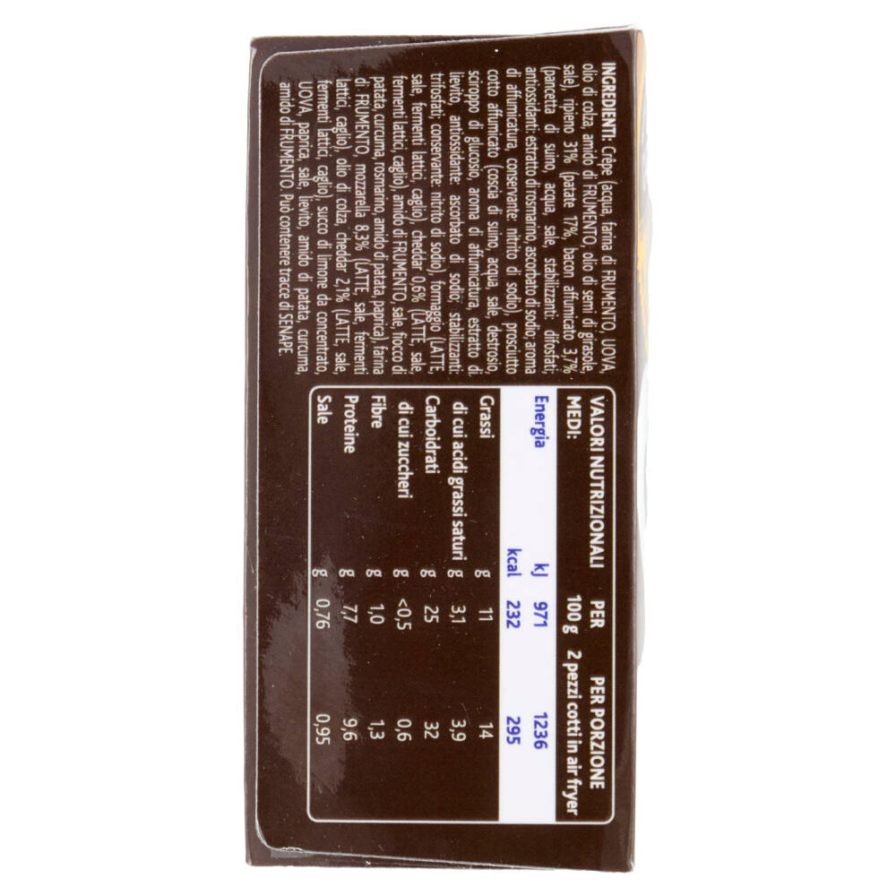 Ripieno 31% (patate 17%, bacon affumicato 3,7% (pancetta di suino, acqua, sale, stabilizzanti: difosfati; antiossidanti: estratto di rosmarino, ascorbato di sodio; aroma di affumicatura, conservante: nitrito di sodio), prosciutto cotto affumicato (coscia di suino, acqua, sale, destrosio, sciroppo di glucosio, aroma di affumicatura, estratto di lievito, antiossidante: ascorbato di sodio, stabilizzanti: trifosfati; conservante: nitrito di sodio), formaggio (latte, sale, fermenti lattici, caglio), cheddar 0,6% (latte, sale, fermenti lattici, caglio), amido di frumento, sale, fiocco di patata, curcuma, rosmarino, amido di patata, paprica)