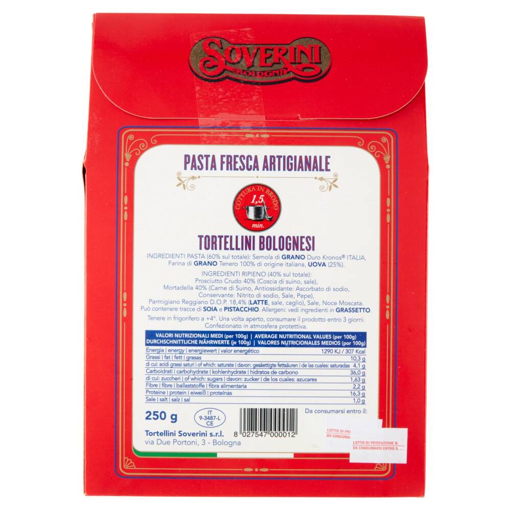 Ingredienti pasta (60% sul totale): semola di grano duro Kronos® ITALIA, farina di grano tenero 100% di origine italiana, uova (25%) Ingredienti ripieno (40% sul totale): prosciutto crudo 40% (coscia di suino, sale), mortadella 40% (carne di suino, antiossidante: ascorbato di sodio, conservante: nitrito di sodio, sale, pepe), Parmigiano Reggiano D.O.P. 18,4% (latte, sale, caglio), sale, noce moscata Può contenere tracce di soia e pistacchio