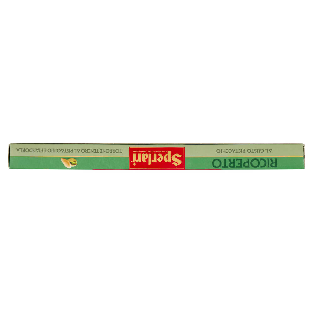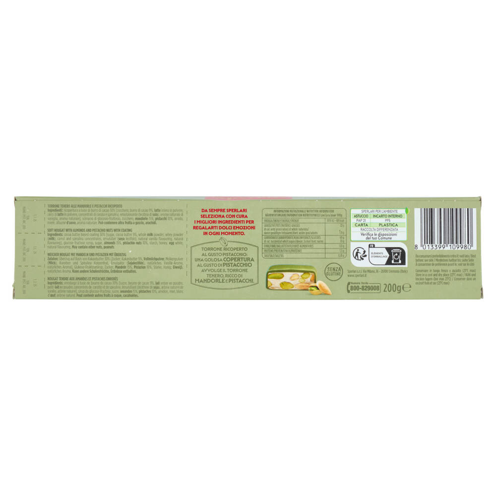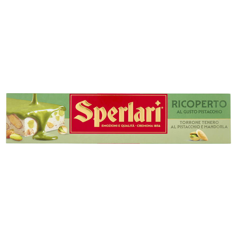 Torrone ricoperto al gusto pistacchio: una golosa copertura al gusto di pistacchio avvolge il torrone tenero, ricco di mandorle e pistacchi.