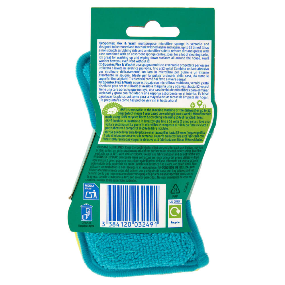 Spontex Flex & Wash è una spugna multiuso e versatile progettata per essere utilizzata e lavata in lavatrice più volte, fino a 52 volte! Combina un lato abrasivo per strofinare delicatamente, un lato in microfibra per pulire e un interno assorbente in spugna. Ideale per la pulizia ordinaria della casa, da tutte le superfici fino ai piatti! Ti chiederai come hai fatto a vivere senza!