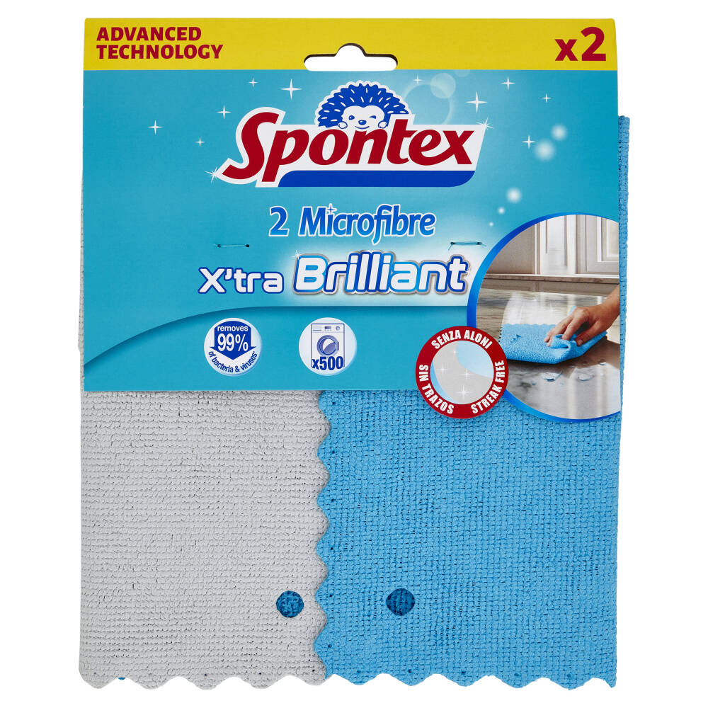 I panni in microfibre Spontex X'tra Brilliant assorbono e puliscono le superfici in modo efficace. Grazie al loro speciale rivestimento sono super efficaci e non lasciano aloni. Questa nuova tecnologia li rende anche facili da risciacquare.