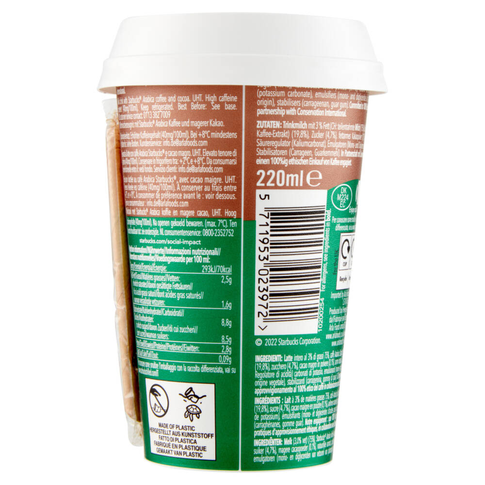 Bevanda al latte con caffè Arabica Starbucks e cacao magro. UHT. Elevato tenore di caffeina (40mg/100ml)