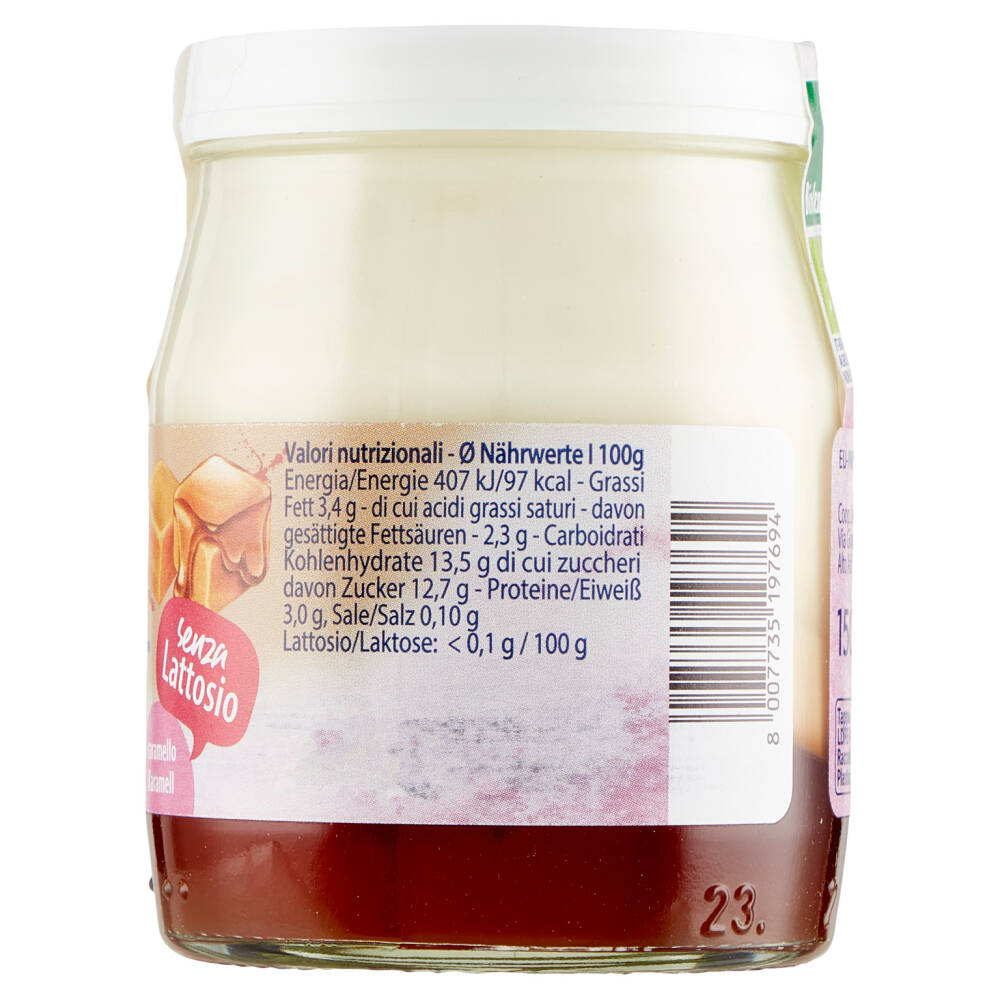 Yogurt intero 80% (latte* intero pastorizzato, fermenti lattici vivi) Preparato al caramello 20% (zucchero*, sciroppo di zucchero caramellato* 3,4% sul totale, amido*, gelificante: pectina; sale, aroma naturale di caramello) Senza glutine *da agricoltura biologica Contiene glucosio e galattosio in conseguenza della scissione del lattosio
