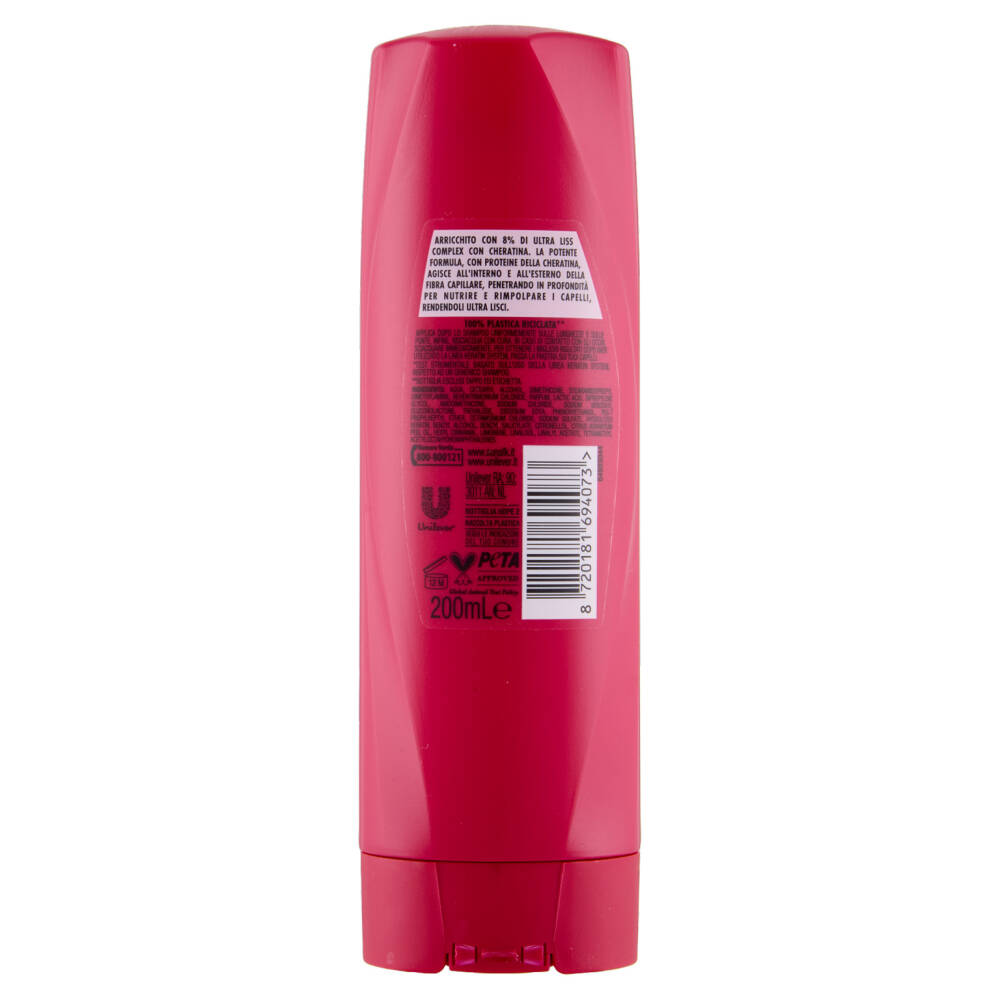Arricchito con 8% di ultra liss complex con cheratina. La potente formula, con proteine della cheratina, agisce all'interno e all'esterno della fibra capillare, penetrando in profondità per nutrire e rimpolpare i capelli, rendendoli ultra lisci.