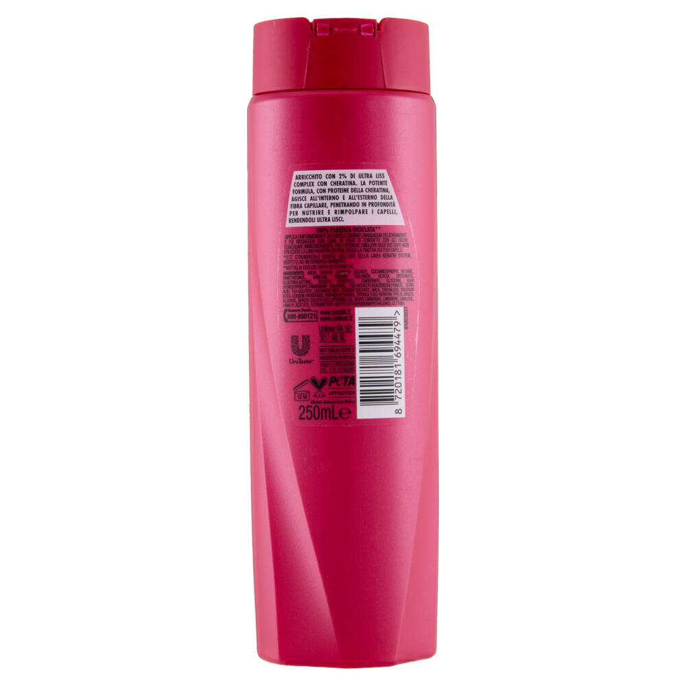 Arricchito con 2% di ultra liss complex con cheratina. La potente formula, con proteine della cheratina, agisce all'interno e all'esterno della fibra capillare, penetrando in profondità per nutrire e rimpolpare i capelli, rendendoli ultra lisci.