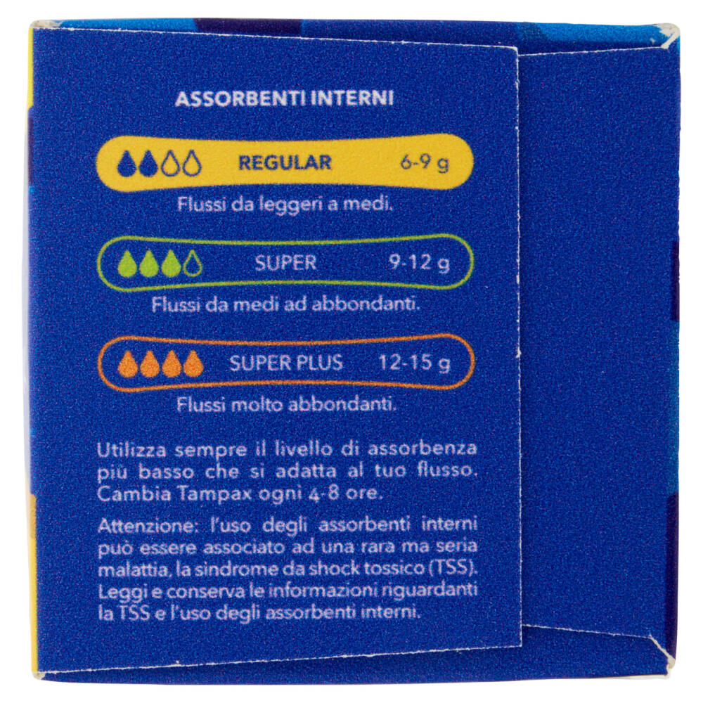 Utilizza sempre il livello di assorbenza più basso che si adatta al tuo flusso. Cambia Tampax ogni 4-8 ore.