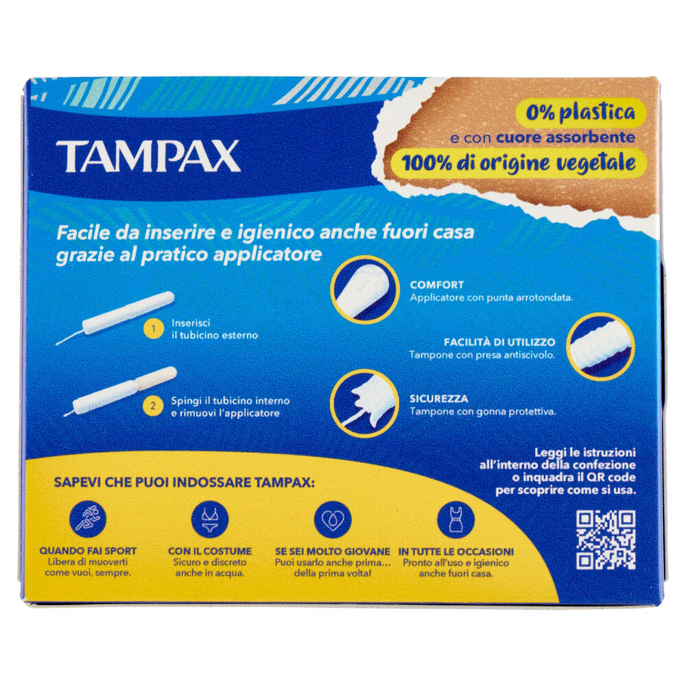 0% Plastica e con cuore assorbente 100% di origine vegetale Protezione fino a 8h #decidoio Assorbenza 2 su 4 Senza profumo Senza coloranti Ginecologicamente testato Il primo Tampax senza plastica