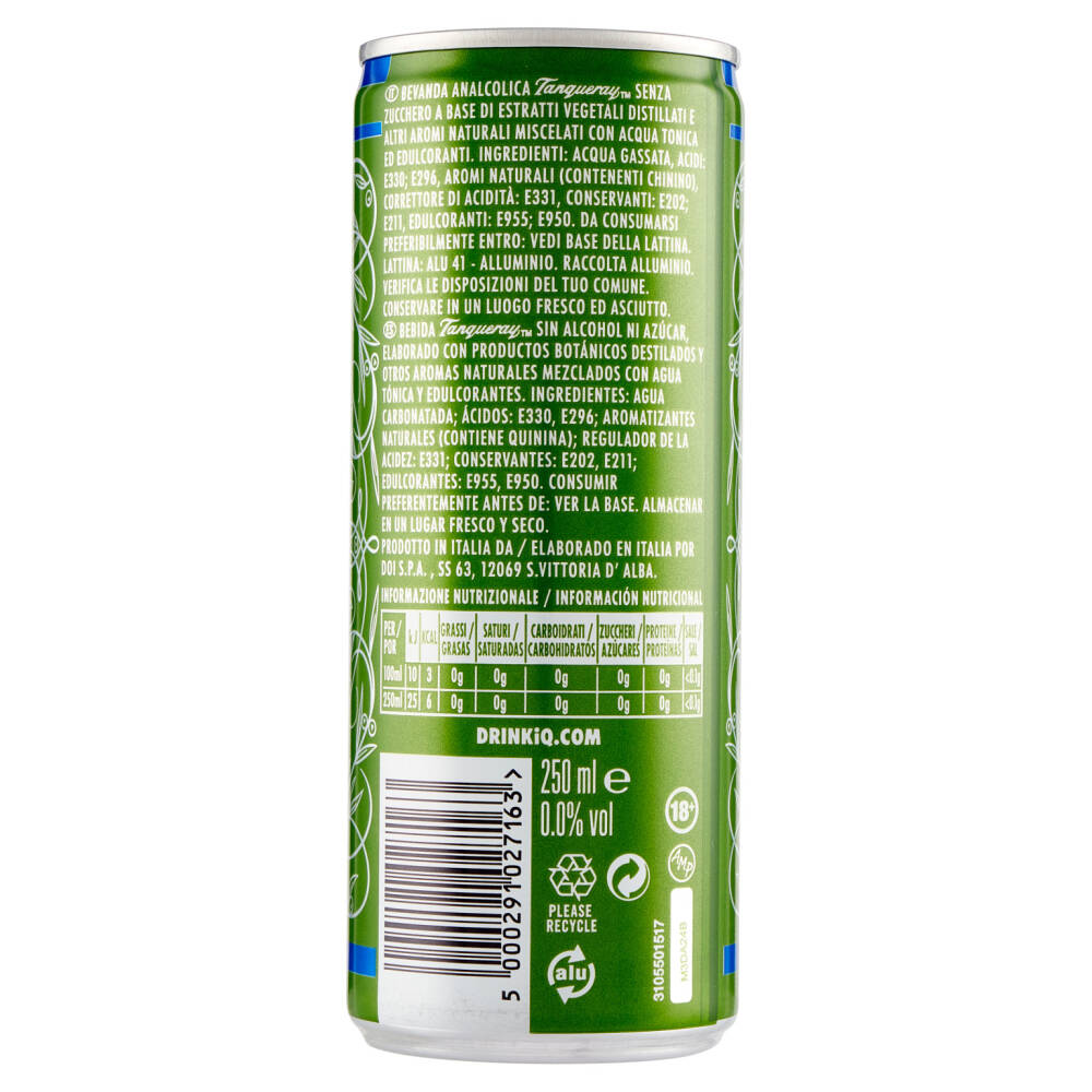 Bevanda analcolica Tanqueray senza zucchero a base di estratti vegetali distillati e altri aromi naturali miscelati con acqua tonica ed edulcoranti