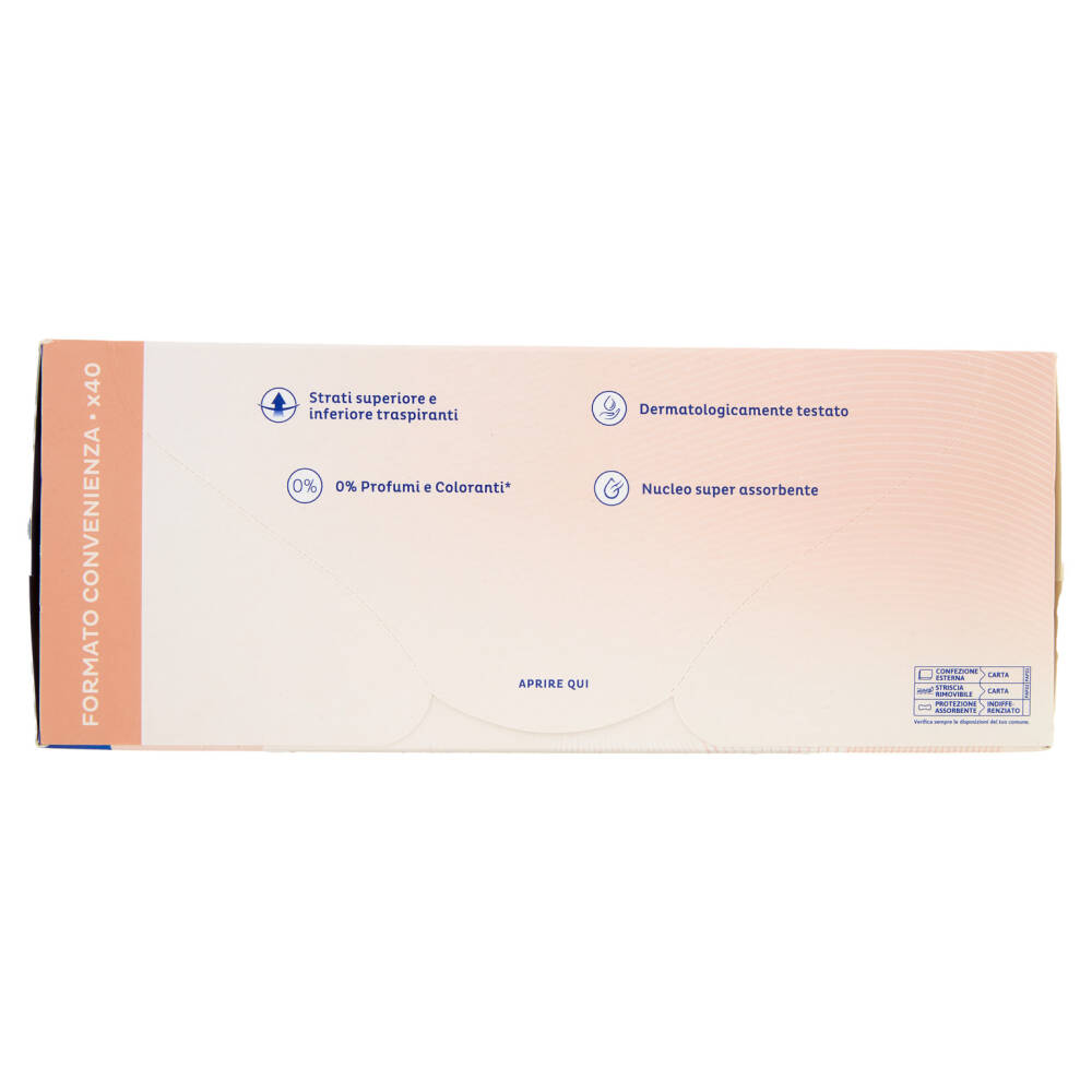 Formato convenienza - x40 Skin care design 0% Profumi e coloranti* Assorbenza 4 su 4 3x Protection - Dry - Secure - Odour control *A contatto con la pelle