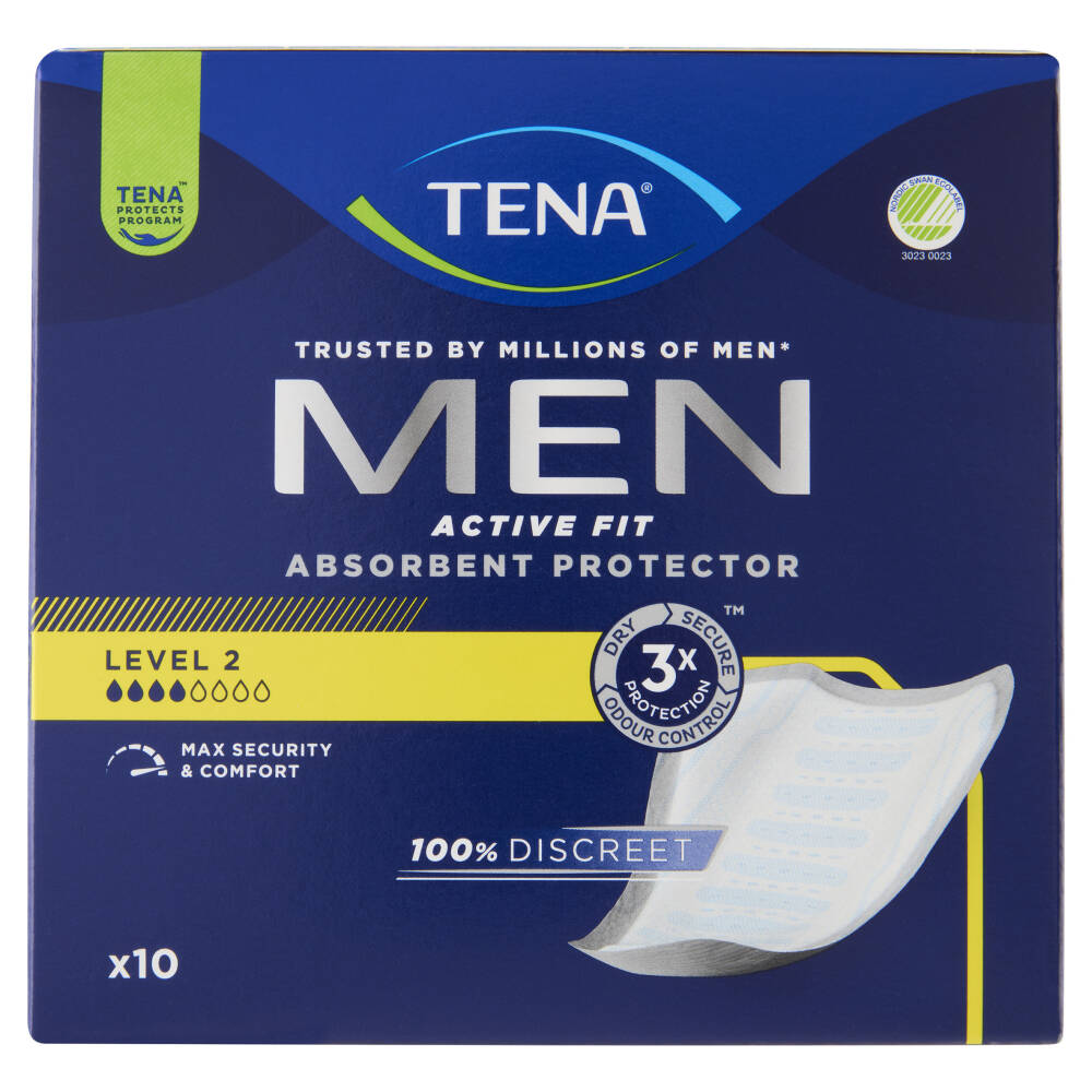 Trusted by millions of men* 3x Protection - Dry - Secure - Odour control Assorbenza 4 su 8 Max security & comfort 100% Discreet x10 *Sulla base delle vendite globali e delle ricerche di mercato, oltre 3 milioni di uomini in tutto il mondo scelgono Tena