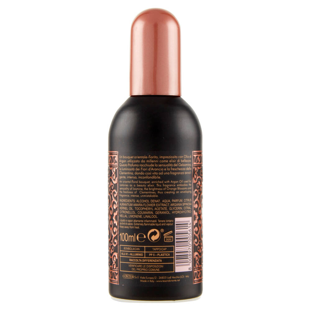 Un bouquet orientale-fiorito, impreziosito con Olio di Argan utilizzato da millenni come elisir di bellezza. Questo Profumo racchiude la sensualità del Gelsomino, la luminosità dei Fiori d'Arancio e la freschezza della Clementina, dando così vita ad una fragranza avvolgente, intensa, inconfondibile.