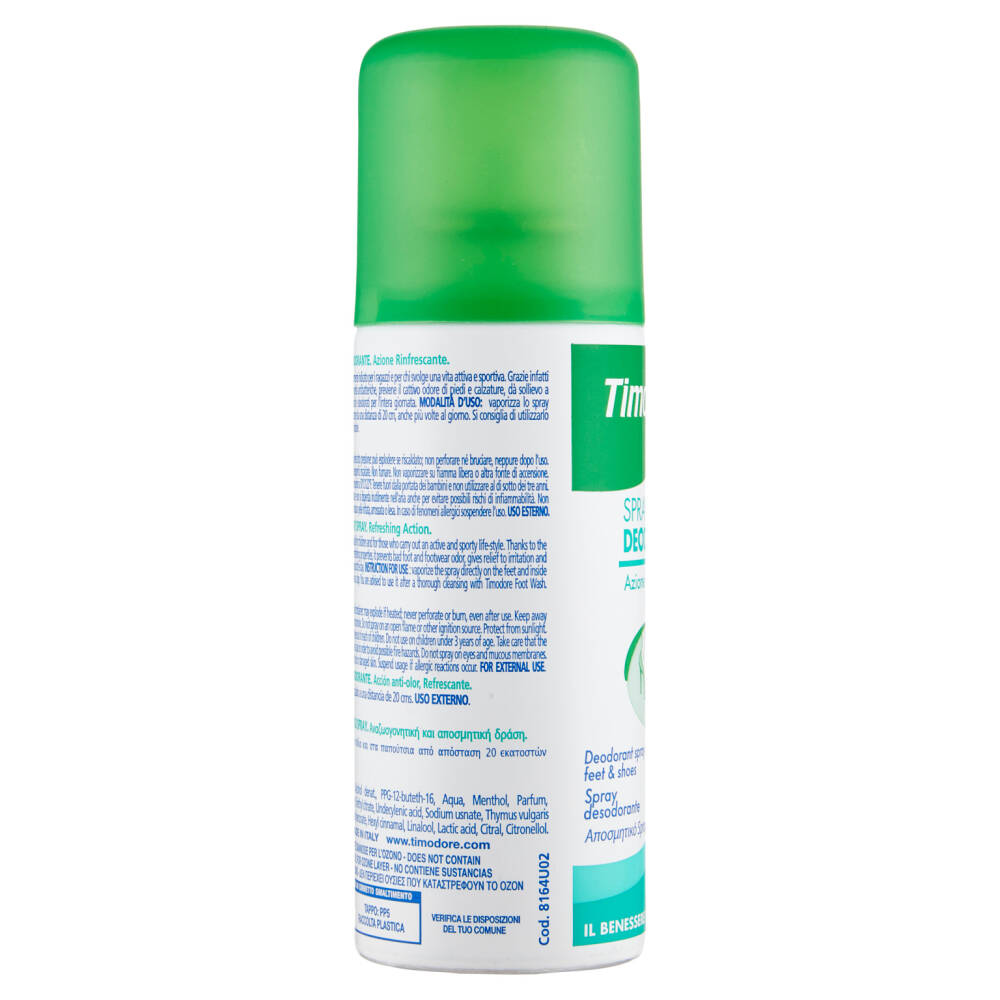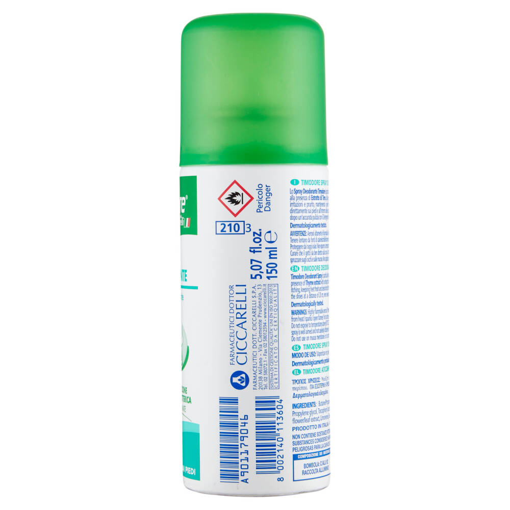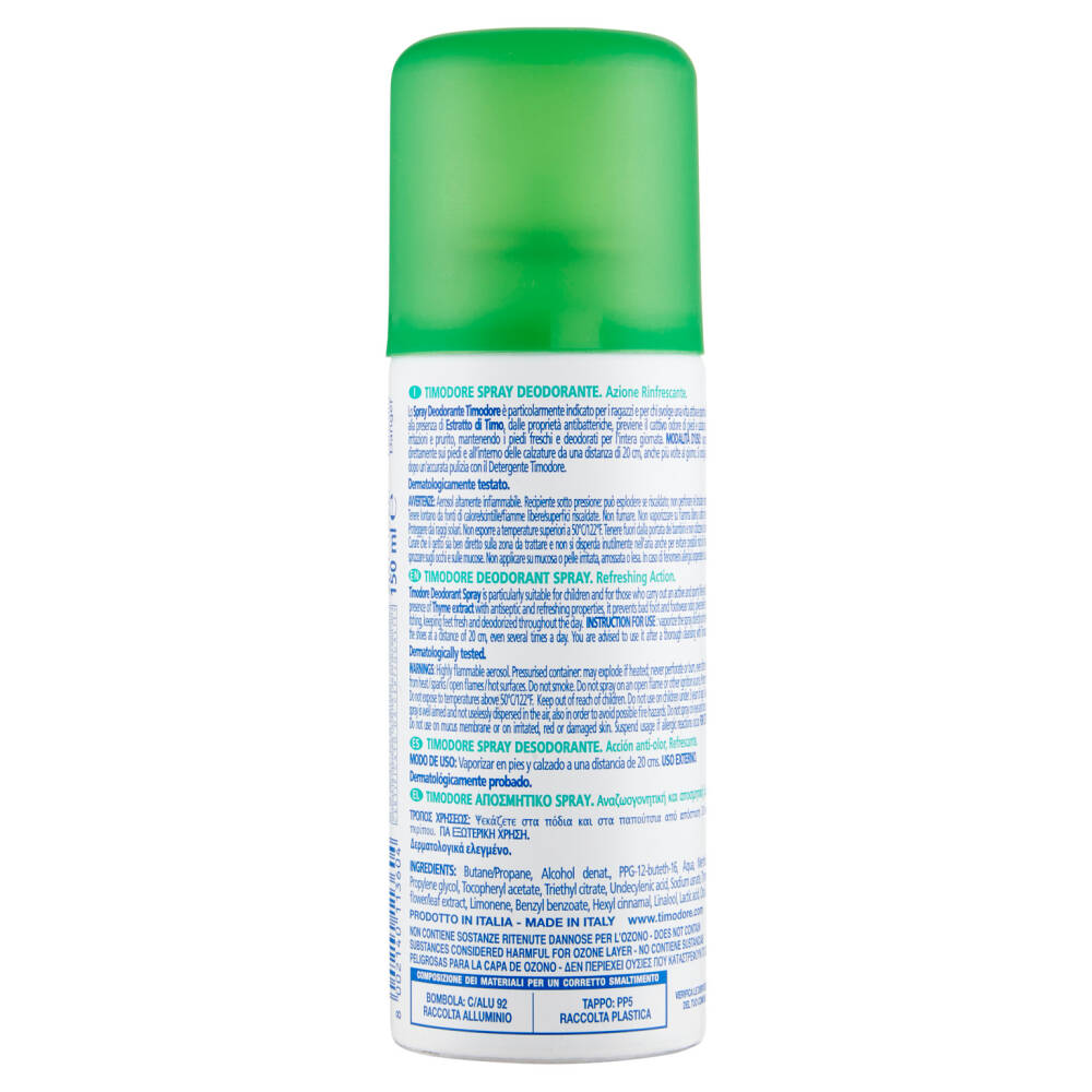 Lo Spray Deodorante Timodore è particolarmente indicato per i ragazzi e per chi svolge una vita attiva e sportiva. Grazie infatti alla presenza di Estratto di Timo, dalle proprietà antibatteriche, previene il cattivo odore di piedi e calzature, dà sollievo a irritazioni e prurito, mantenendo i piedi freschi e deodorati per l'intera giornata.