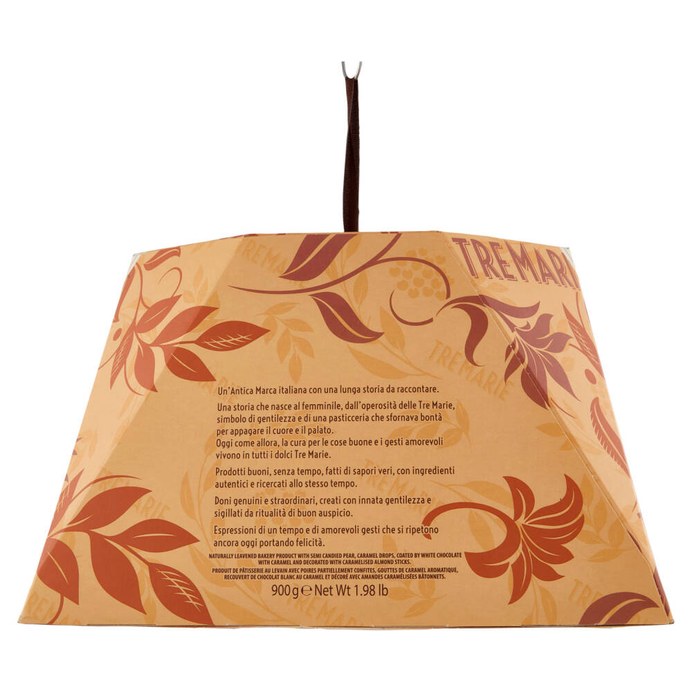 Con gocce al caramello, cubetti di pere williams e copertura di cioccolato bianco al caramello
