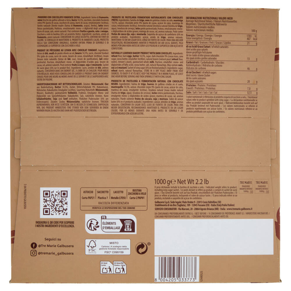 Farina di frumento Uova fresche da galline allevate a terra Burro 14,5% Zucchero Cioccolato fondente extra 9% (pasta di cacao, zucchero di canna, burro di cacao, emulsionante: lecitina) Lievito naturale [lievito madre (farina di frumento, acqua), lievito] Latte intero fresco pastorizzato Fruttosio Emulsionante: mono- e digliceridi degli acidi grassi Burro di cacao Sale Aromi naturali Può contenere frutta a guscio, soia e senape Zucchero a velo in bustina (6% sul prodotto finito). Ingredienti: zucchero, amido di frumento, aromi naturali