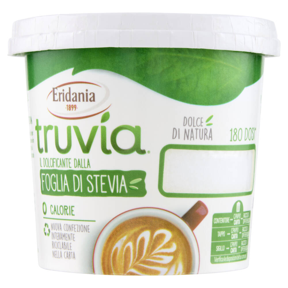 Dolce di natura 180 Dosi* Il dolcificante dalla foglia di stevia O Calorie *1 dose ≈ 1/3 cucchiaino di Truvia (1,5 g) ≈ 1 cucchiaino di zucchero (4,5 g)