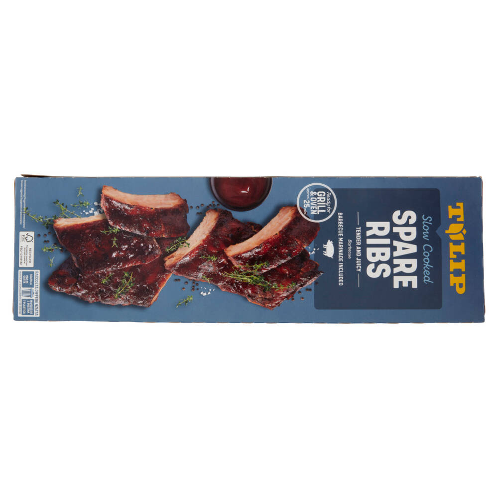 Spareribs (91%): Costine di suino di maiale con carne (89%), acqua, sale, maltodestrina, amido di mais modificato, regolatore di acidità (E 331), sciroppo di zucchero caramellato, aglio, pepe, polvere di pomodoro, zucchero, destrosio, estratto di spezie
