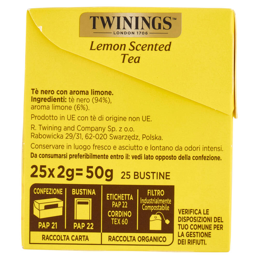 Twinings seleziona le migliori foglie di tè da preziosi giardini per realizzare questa miscela in cui il sapore deciso viene sapientemente completato con il brioso aroma di limoni. Lemon Scented è un tè dal colore intenso in tazza, dal profumo inebriante e dal sapore fresco e fruttato.
