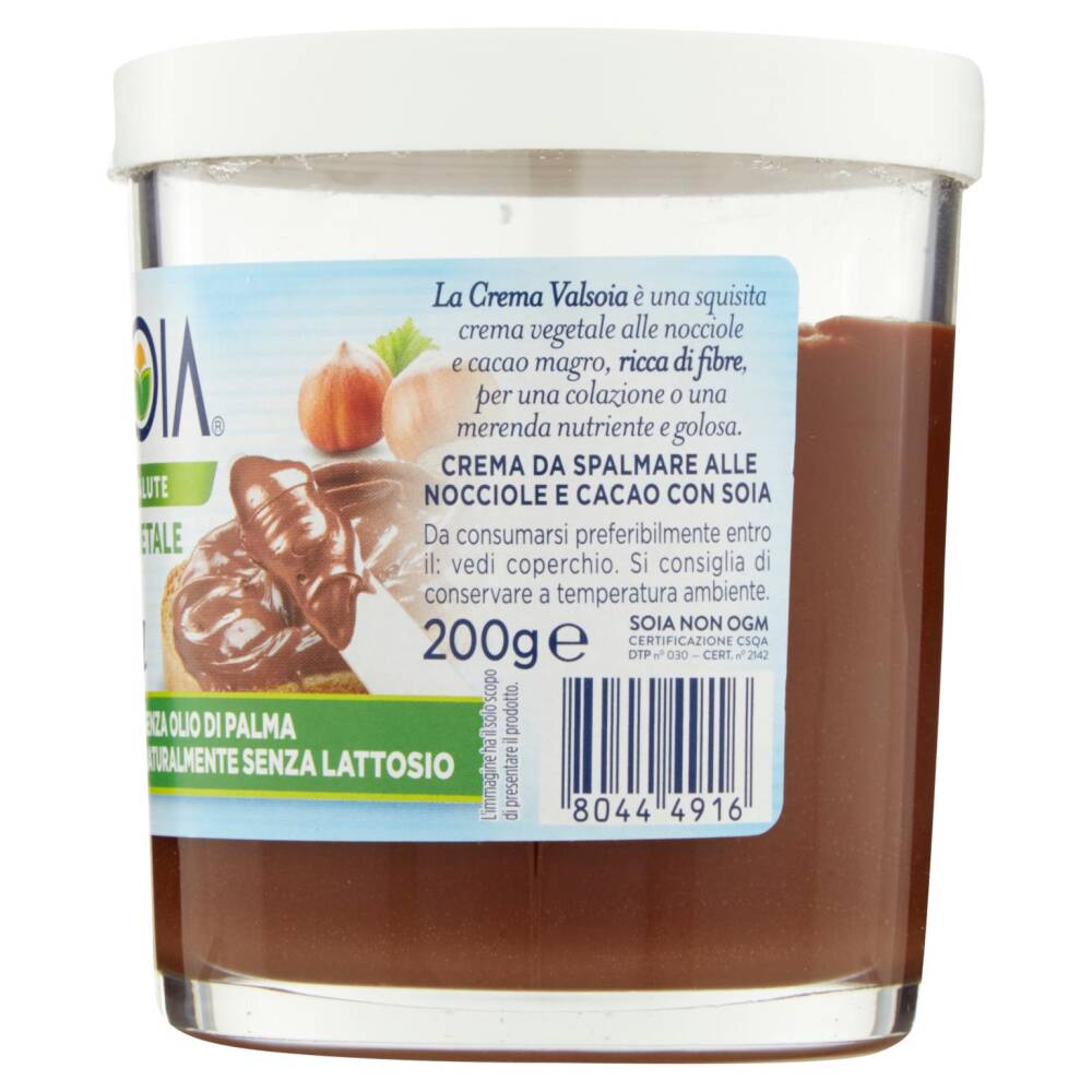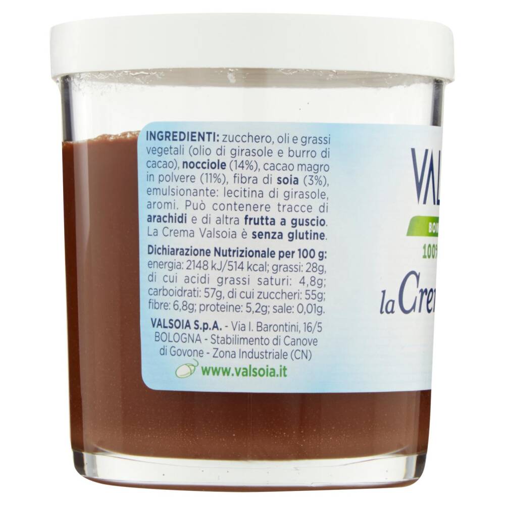 Zucchero Oli e grassi vegetali (olio di girasole e burro di cacao) Nocciole (14%) Cacao magro in polvere (11%) Fibra di soia (3%) Emulsionante: lecitina di girasole Aromi Può contenere tracce di arachidi e di altra frutta a guscio La crema Valsoia è senza glutine