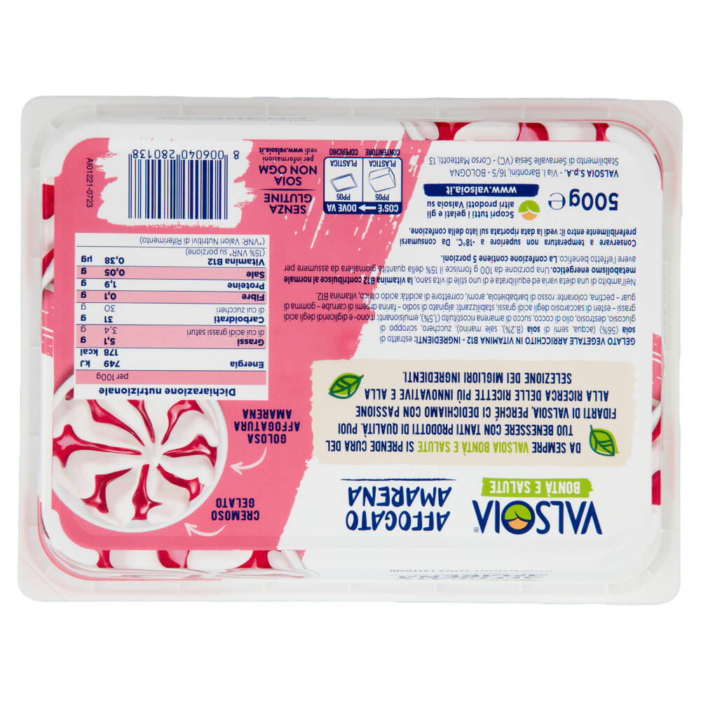 Estratto di soia (56%) (acqua, semi di soia (8,2%), sale marino) Zucchero Sciroppo di glucosio Destrosio Olio di cocco Succo di amarena ricostituito (1,5%) Emulsionanti: mono- e digliceridi degli acidi grassi, esteri di saccarosio degli acidi grassi Stabilizzanti: alginato di sodio, farina di semi di carrube, gomma di guar, pectina Colorante: rosso di barbabietola Aromi Correttore di acidità: acido citrico Vitamina B12
