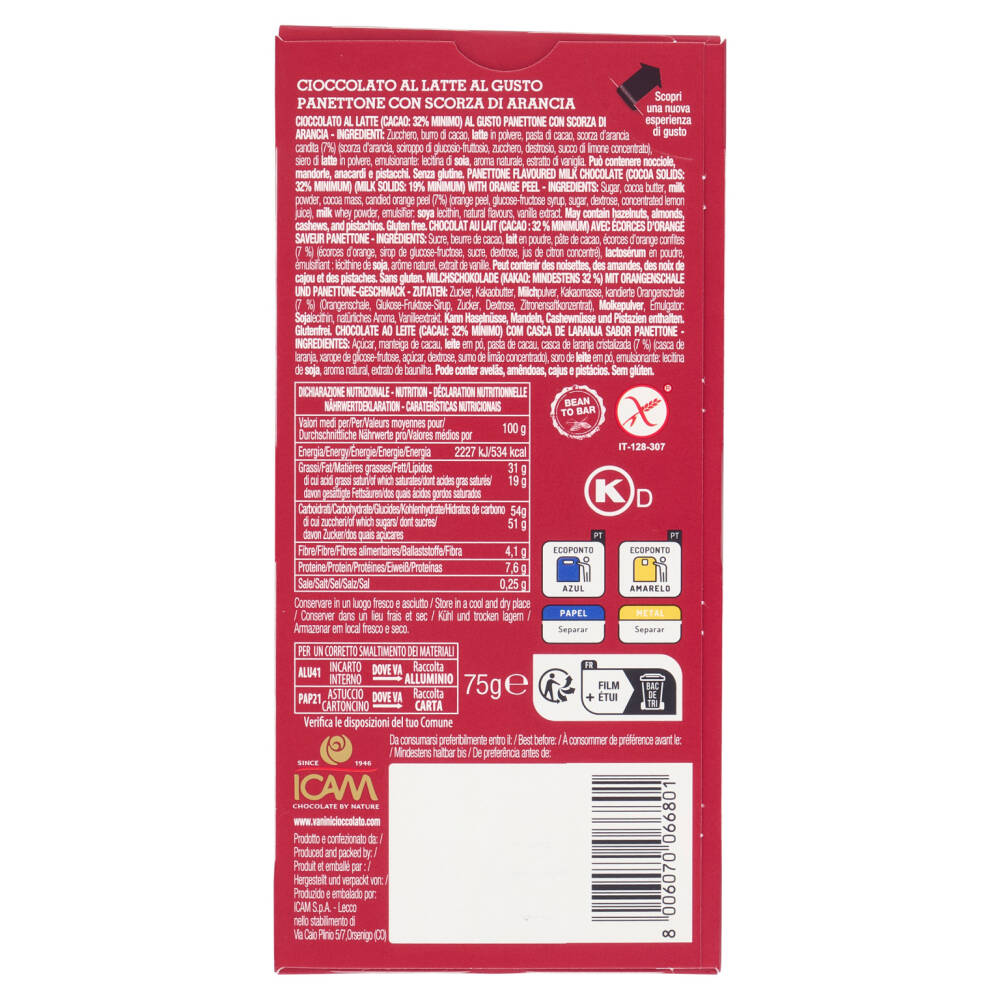 Zucchero Burro di cacao Latte in polvere Pasta di cacao Scorza d'arancia candita (7%) (scorza d'arancia, sciroppo di glucosio-fruttosio, zucchero, destrosio, succo di limone concentrato) Siero di latte in polvere Emulsionante: lecitina di soia Aroma naturale Estratto di vaniglia Può contenere nocciole, mandorle, anacardi e pistacchi Senza glutine