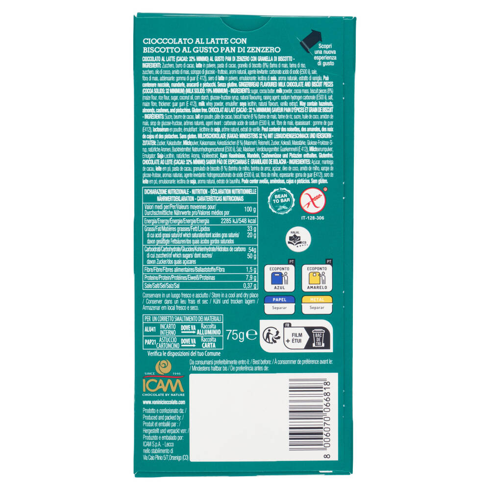 Zucchero Burro di cacao Latte in polvere Pasta di cacao Granella di biscotto (8%) (farina di mais, farina di riso, zucchero, olio di cocco, amido di mais, sciroppo di glucosio-fruttosio, aromi naturali, agente lievitante: carbonato acido di sodio (E500 ii), sale, fibra di mais, addensante: gomma di guar (E 412)) Siero di latte in polvere Emulsionante: lecitina di soia Aroma naturale Estratto di vaniglia Può contenere nocciole, mandorle, anacardi e pistacchi Senza glutine
