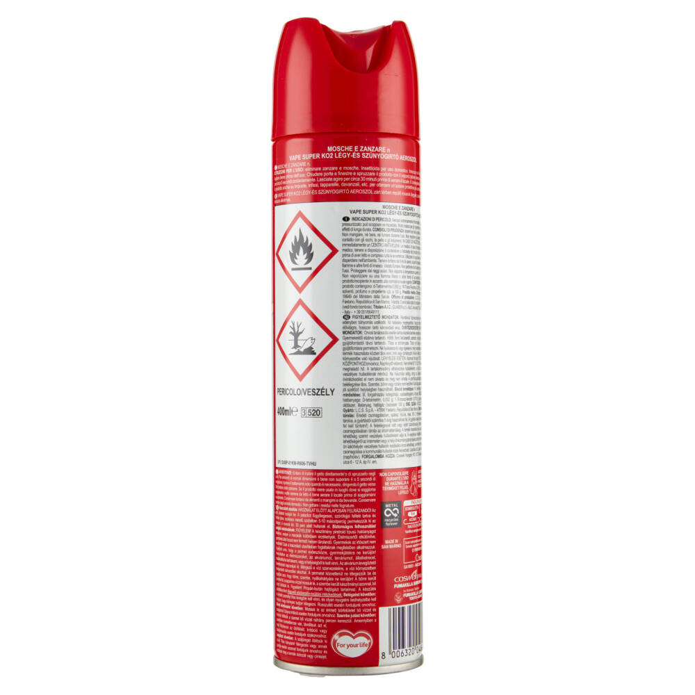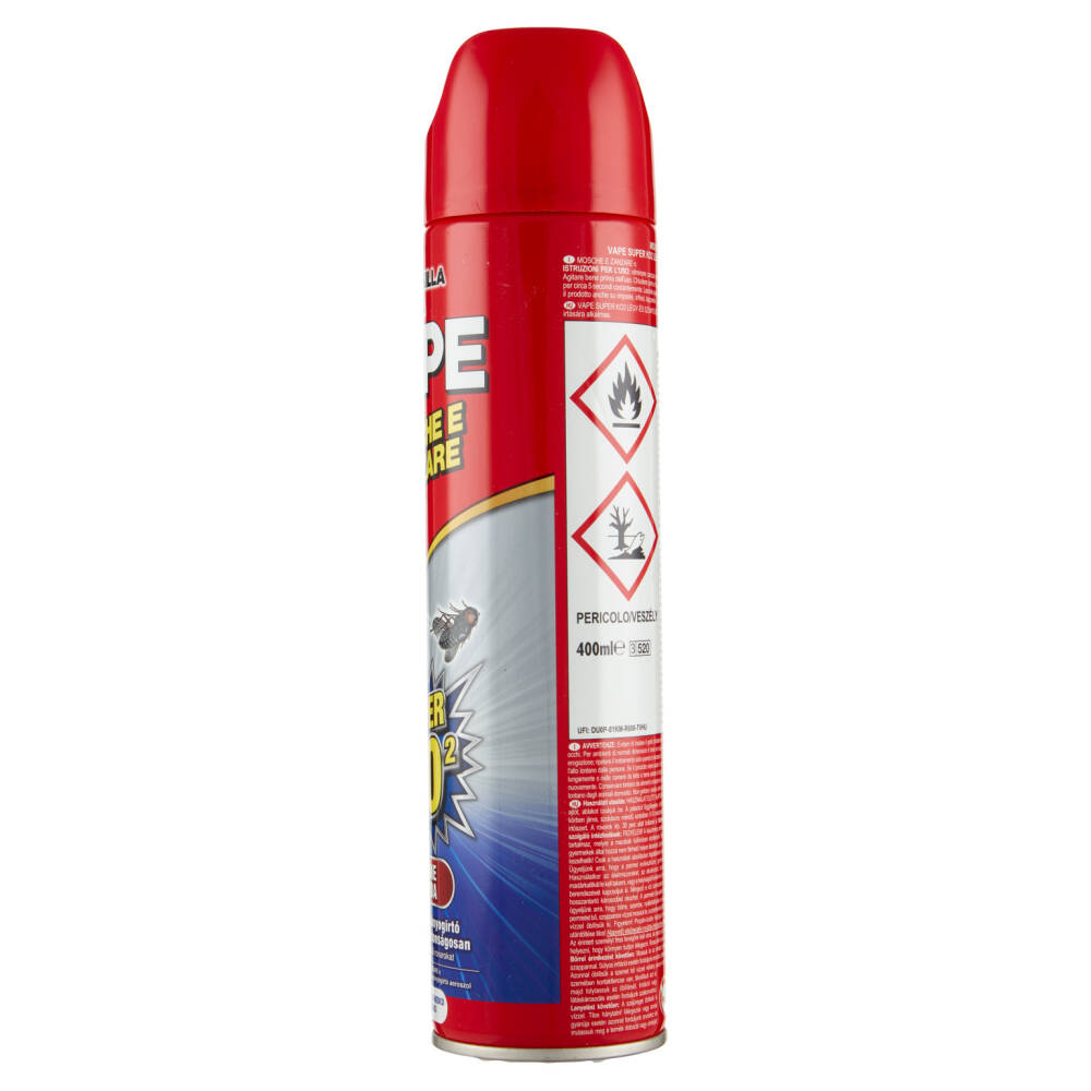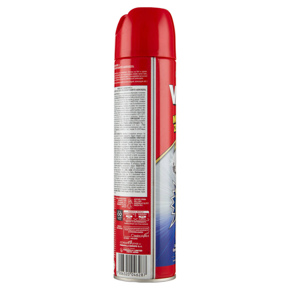 Istruzioni per l'uso: eliminare zanzare e mosche. Insetticida per uso domestico. Innocuo su fiori e piante. Agitare bene prima dell'uso. Chiudere porte e finestre e spruzzare il prodotto con il vaporizzatore diretto verso l'alto, per circa 5 secondi costantemente. Lasciate agire per circa 30 minuti prima di aerare il locale. È consigliabile spruzzare il prodotto anche su imposte, infissi, tapparelle, davanzali, etc. per ottenere un'azione protettiva più prolungata.