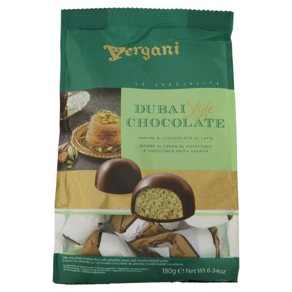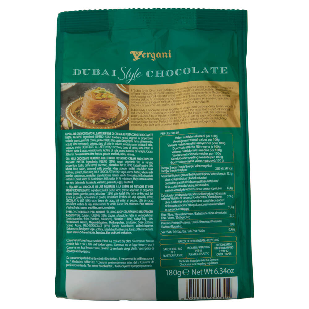 Ripieno (55%): zucchero, grassi vegetali in proporzione variabile (palma, palmisti, cocco), pistacchi (13.8%), pasta kadayif (8%: farina di frumento, acqua), latte scremato in polvere, siero di latte in polvere, emulsionante: lecitina di soia, spinacio, aroma