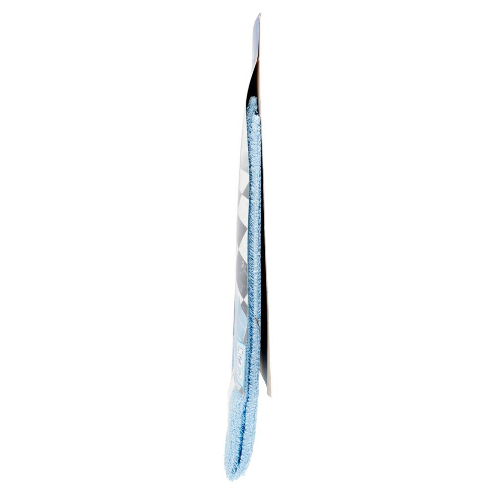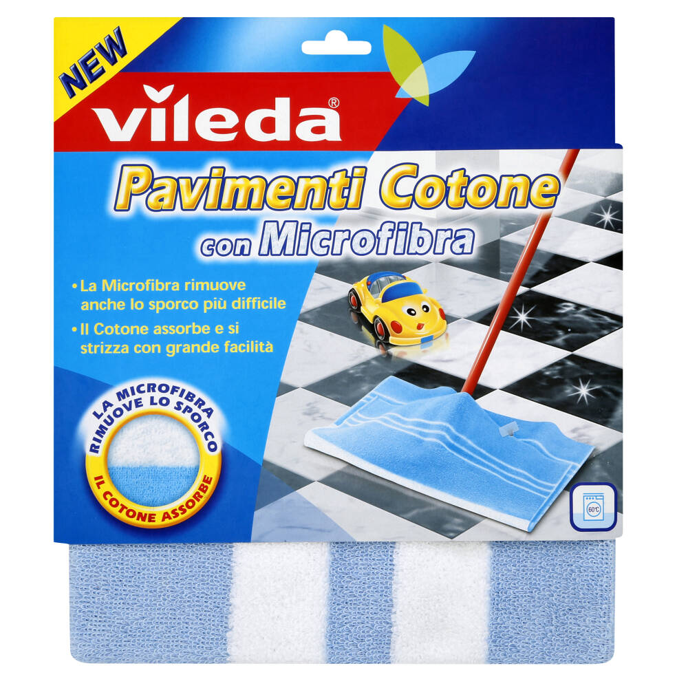 Pavimenti Cotone con Microfibra, ideale per pulire tutti i tipi di pavimento. La parte blu in cotone è molto assorbente e facile da strizzare. La strisce bianche in microfibra eliminano le macchie di sporco, anche senza l'uso di detergenti.