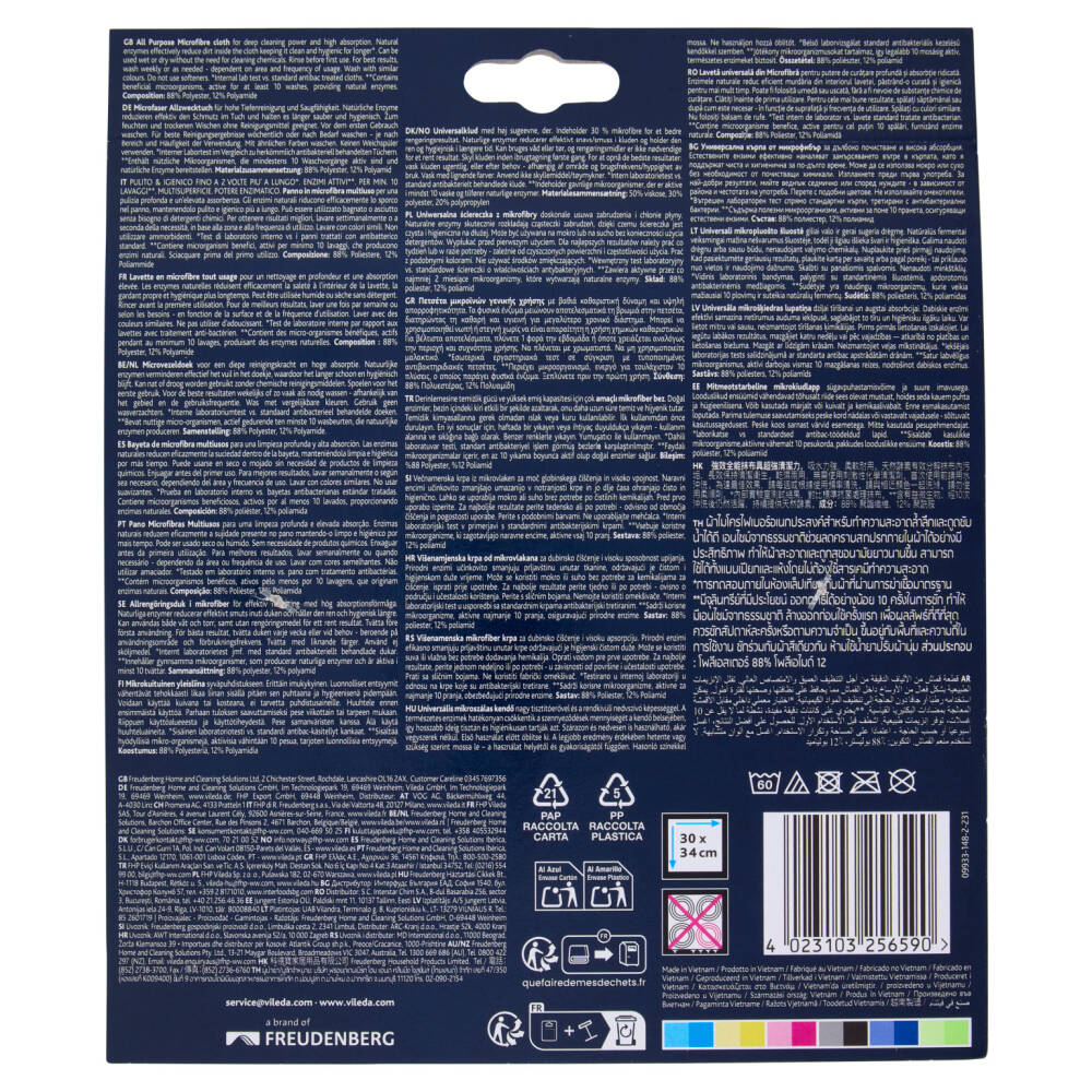 Pulito & igienico fino a 2 volte più a lungo*. Enzimi attivi**. Per min. 10 lavaggi**. Multisuperficie. Potere enzimatico. Panno in microfibra multiuso per una pulizia profonda e un'elevata assorbenza. Gli enzimi naturali riducono efficacemente lo sporco nel panno, mantenendolo pulito e igienico più a lungo.