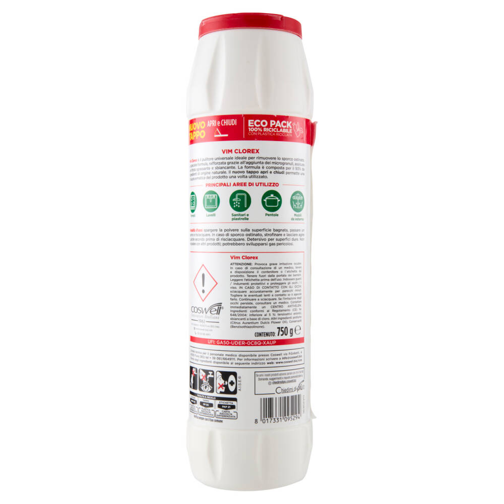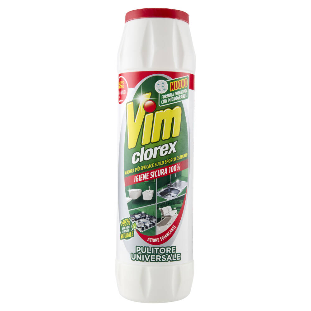Vim Clorex è il pulitore universale ideale per rimuovere lo sporco ostinato. La speciale formula, rafforzata grazie all'aggiunta dei microgranuli, assicura una forza sgrassante e sbiancante. La formula è composta per il 93% da ingredienti di origine naturale. Il nuovo tappo apri e chiudi permette una chiusura ermetica del prodotto una volta utilizzato.