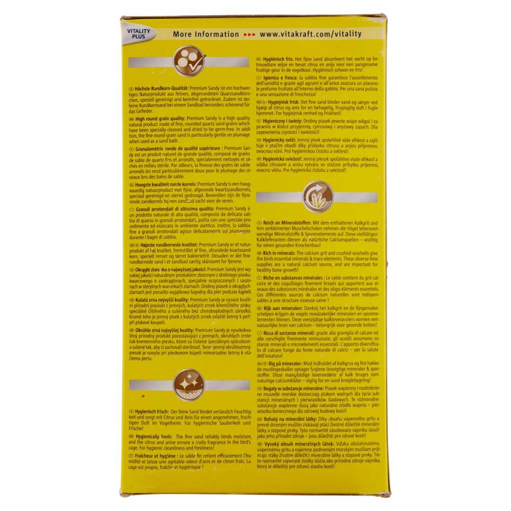 Granuli arrotondati di altissima qualità: Premium Sandy è un prodotto naturale di alta qualità, composto da delicata sabbia di quarzo in granuli arrotondati, pulita con uno speciale procedimento ed essiccata in ambiente asettico. Inoltre, la sabbia fine a granuli arrotondati agisce delicatamente sul piumaggio durante i bagni di sabbia.