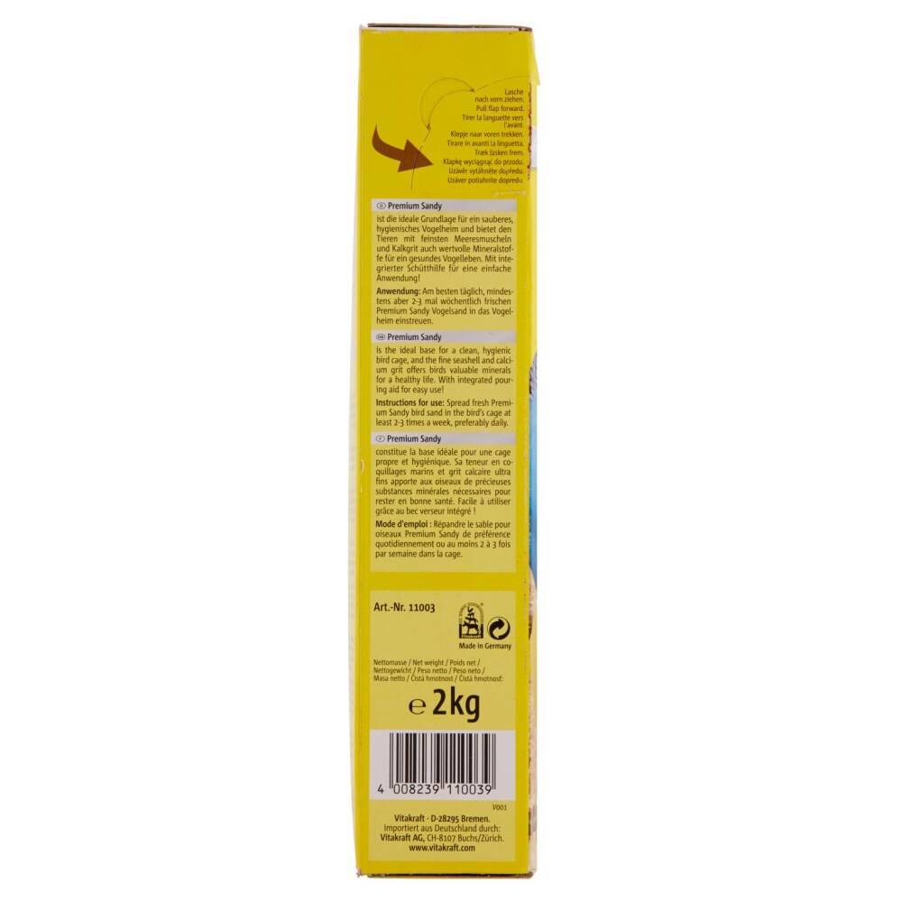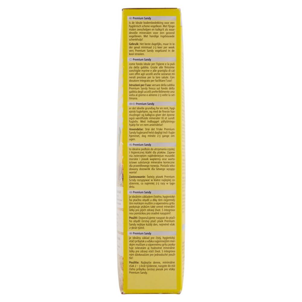 Premium Sandy come fondo ideale per l'igiene e la pulizia della gabbia. Grazie alle finissime conchiglie marine e alla graniglia di calcare offre agli uccelli anche sostanze minerali preziose per la loro salute. Con dosatore integrato per facilitare l'uso!