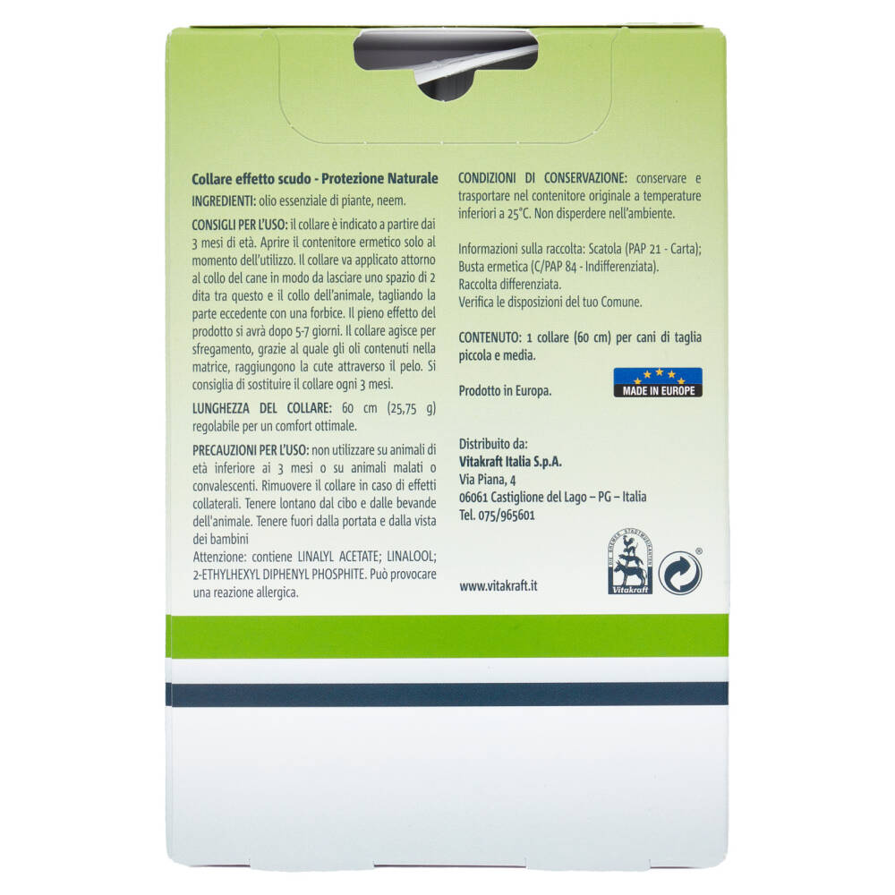 Consigli per l'uso: il collare è indicato a partire dai 3 mesi di età. Aprire il contenitore ermetico solo al momento dell'utilizzo. Il collare va applicato attorno al collo del cane in modo da lasciare uno spazio di 2 dita tra questo e il collo dell'animale, tagliando la parte eccedente con una forbice. Il pieno effetto del prodotto si avrà dopo 5-7 giorni. Il collare agisce per sfregamento, grazie al quale gli oli contenuti nella matrice, raggiungono la cute attraverso il pelo. Si consiglia di sostituire il collare ogni 3 mesi.