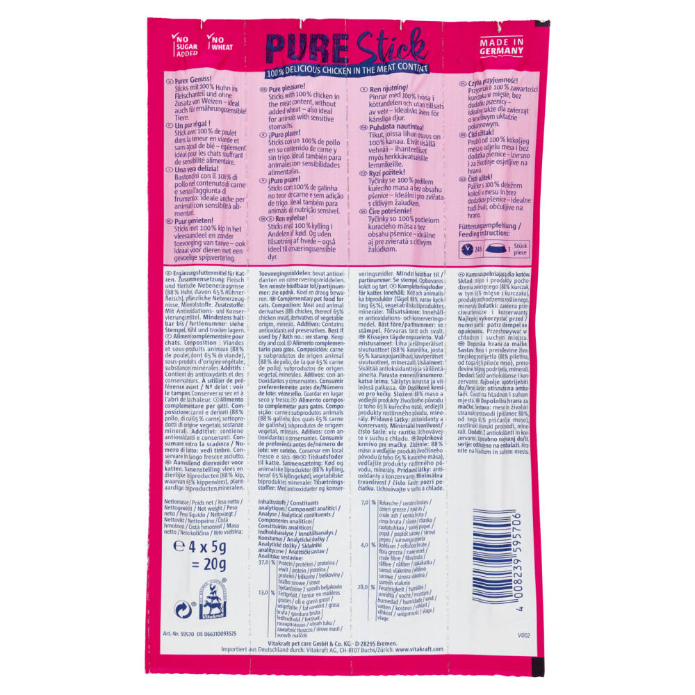 4 Sticks - No sugar added - No wheat 100% Delicious chicken in the meat content Pollo