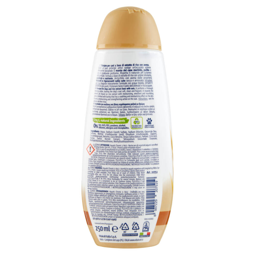 Grazie ai suoi principi attivi svolge un'accurata azione detergente lasciando il manto del cane morbido, pulito e con un gradevole profumo. Rispetta il naturale pH cutaneo dell'animale. Formula a base di estratto di riso con azione idratante, emolliente e nutriente. Arricchito con avena dalle proprietà idratanti e rigeneranti sulla cute secca e arrossata.