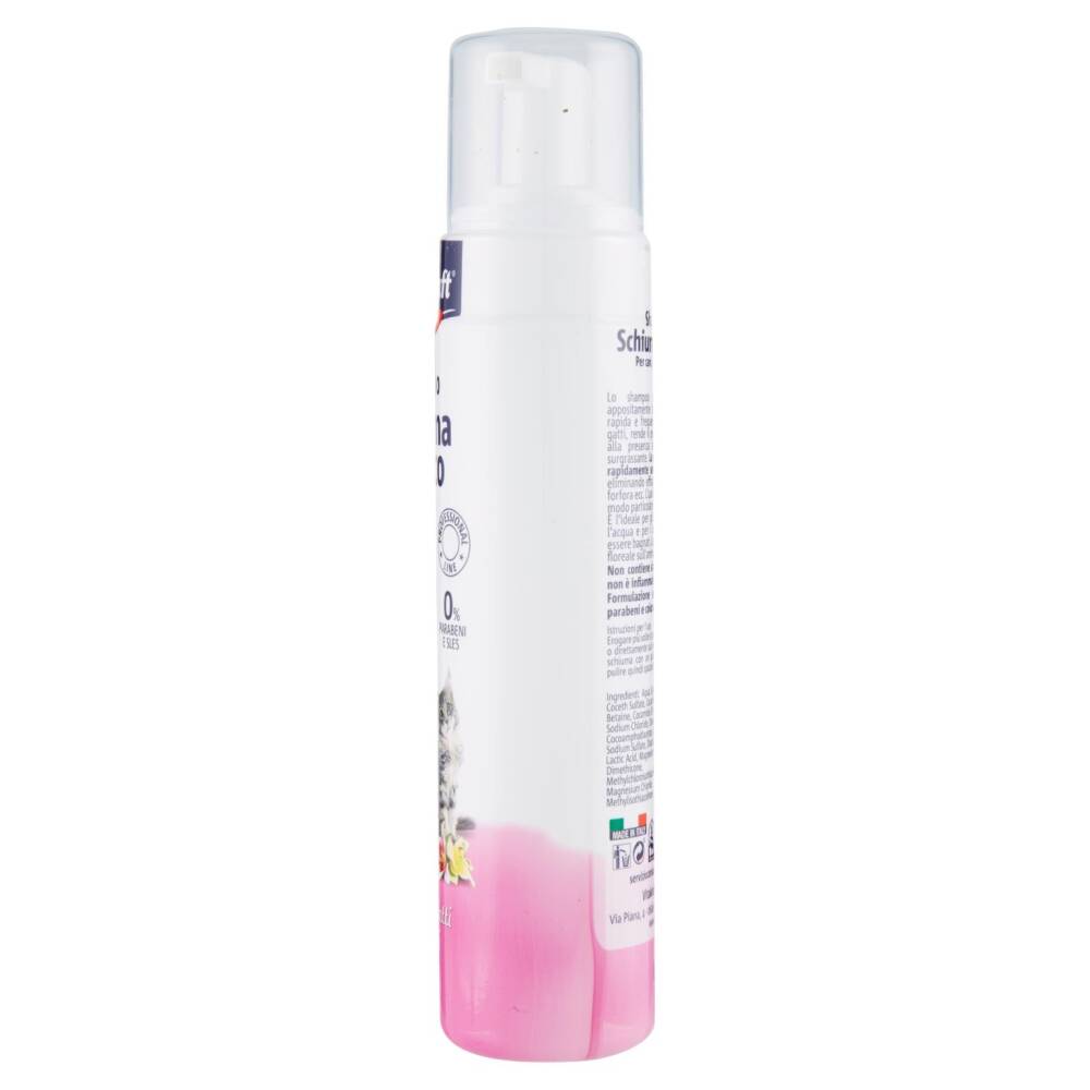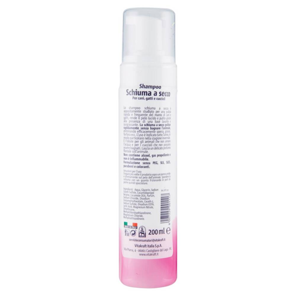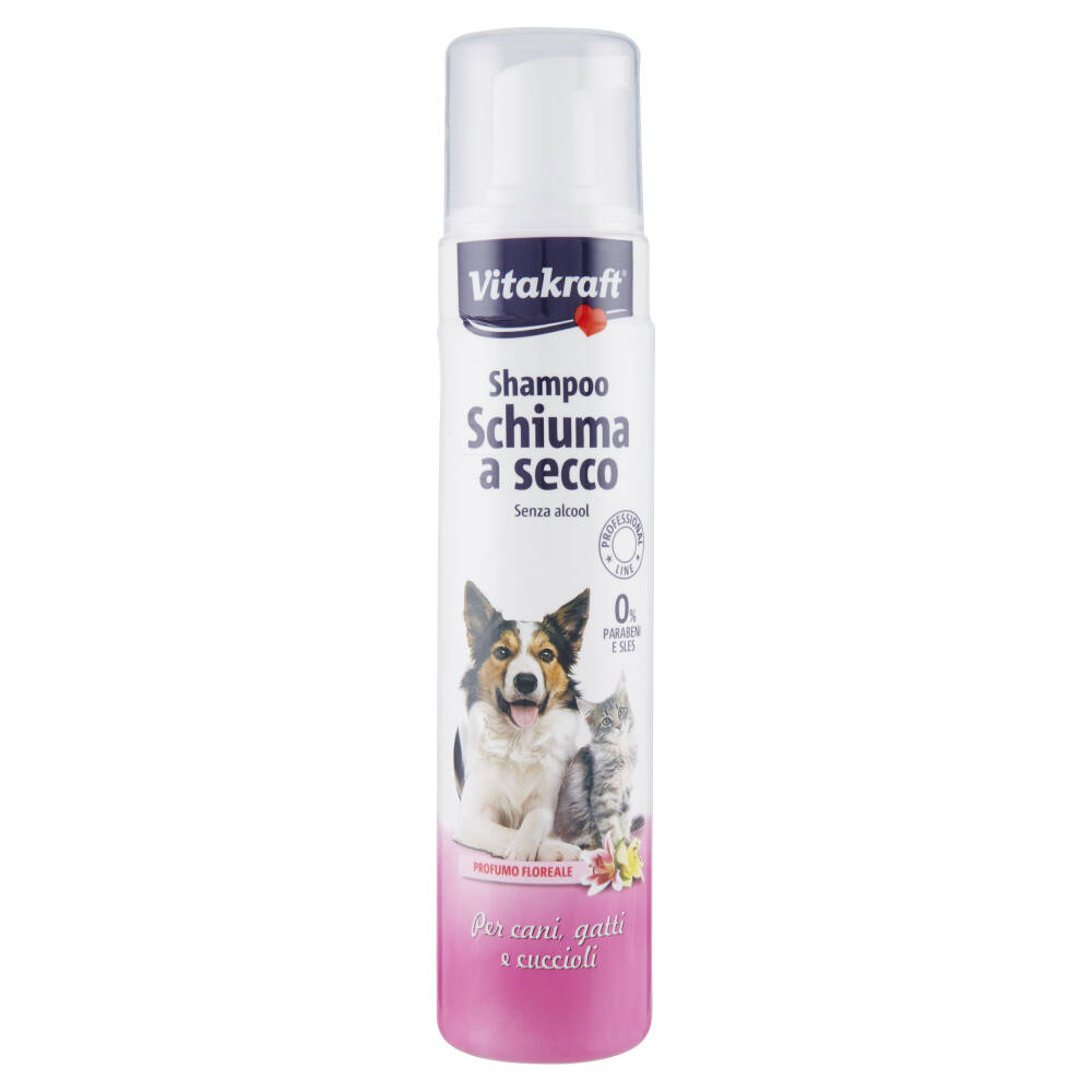 Lo shampoo schiuma a secco è appositamente studiato per una pulizia rapida e frequente del manto di cani e gatti, rende il pelo lucido e pulito grazie alla presenza di una base lavante e surgrassante. La schiuma a secco pulisce rapidamente senza bagnare l'animale, eliminando efficacemente sporco, grasso, forfora ecc. L'uso è indicato tutto l'anno, in modo particolare nella stagione invernale. È l'ideale per gli animali che non amano l'acqua e per i cuccioli che non possono essere bagnati. Lascia un delicato profumo floreale sull'animale.