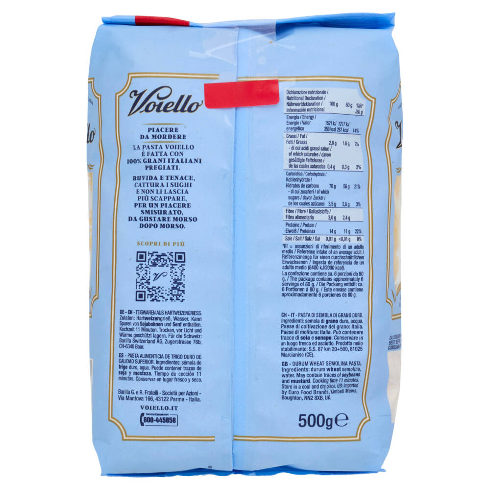 Piacere da mordere La pasta Voiello è fatta con 100% grani italiani pregiati. Ruvida e tenace, cattura i sughi e non li lascia più scappare, per un piacere smisurato, da gustare morso dopo morso.