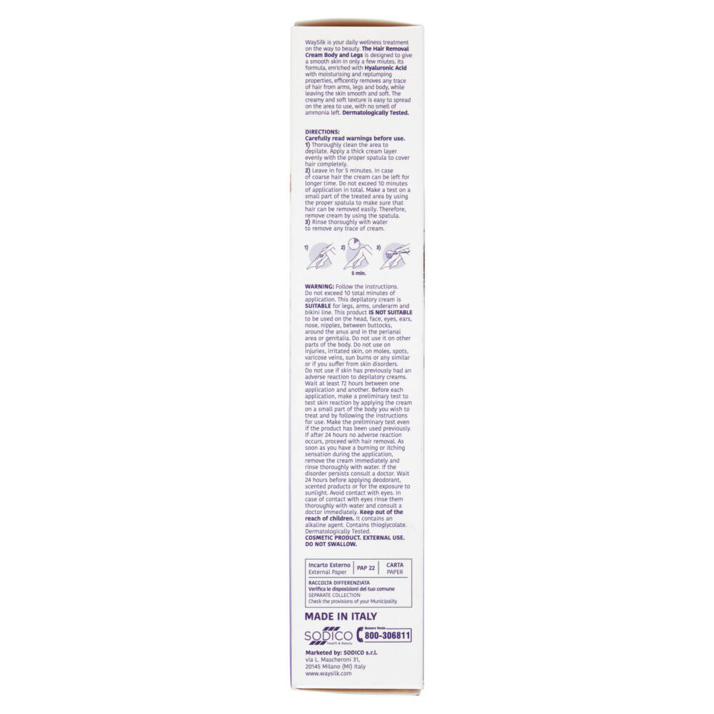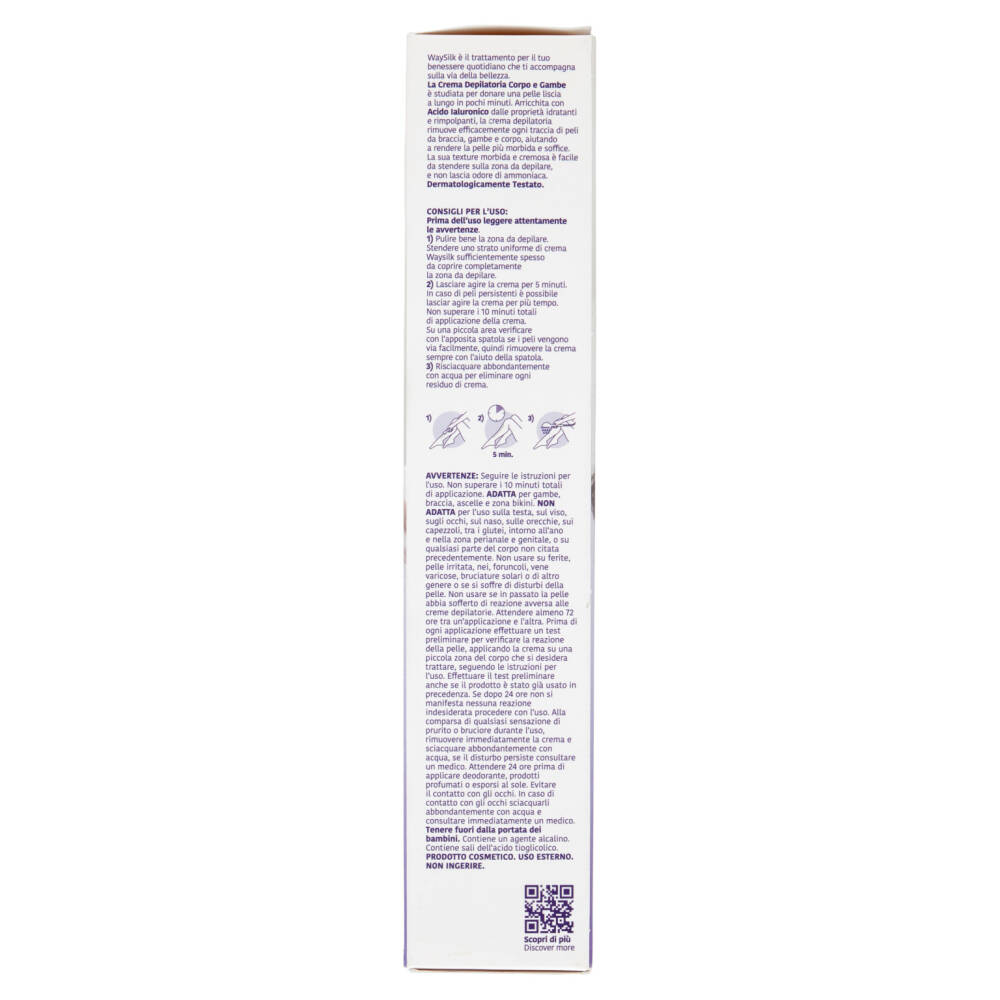 1) Pulire bene la zona da depilare. Stendere uno strato uniforme di crema Waysilk sufficientemente spesso da coprire completamente la zona da depilare.