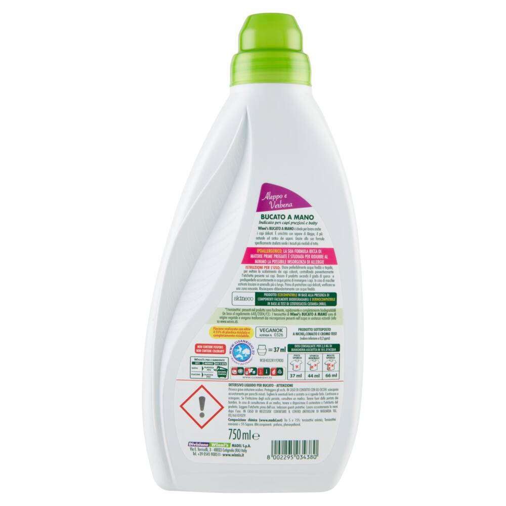 Ipoallergenico Nichel, Cobalto, Cromo Tested Econatura - A basso impatto ambientale Naturel Indicato per capi preziosi e baby Con vero sapone di Aleppo e profumo di verbena 20 Lavaggi Qualità Italiana Con Materie Prime di Origine Vegetale Da fonti rinnovabili completamente biodegradabili* *I tensioattivi presenti nel prodotto sono facilmente, rapidamente e completamente biodegradabili (in base al regolamento 648/2004/CE). I tensioattivi di Winni's Bucato a Mano sono di origine vegetale e vengono trasformati dai microrganismi presenti nell'acqua in sostanze naturali (info su www.winnis.it)