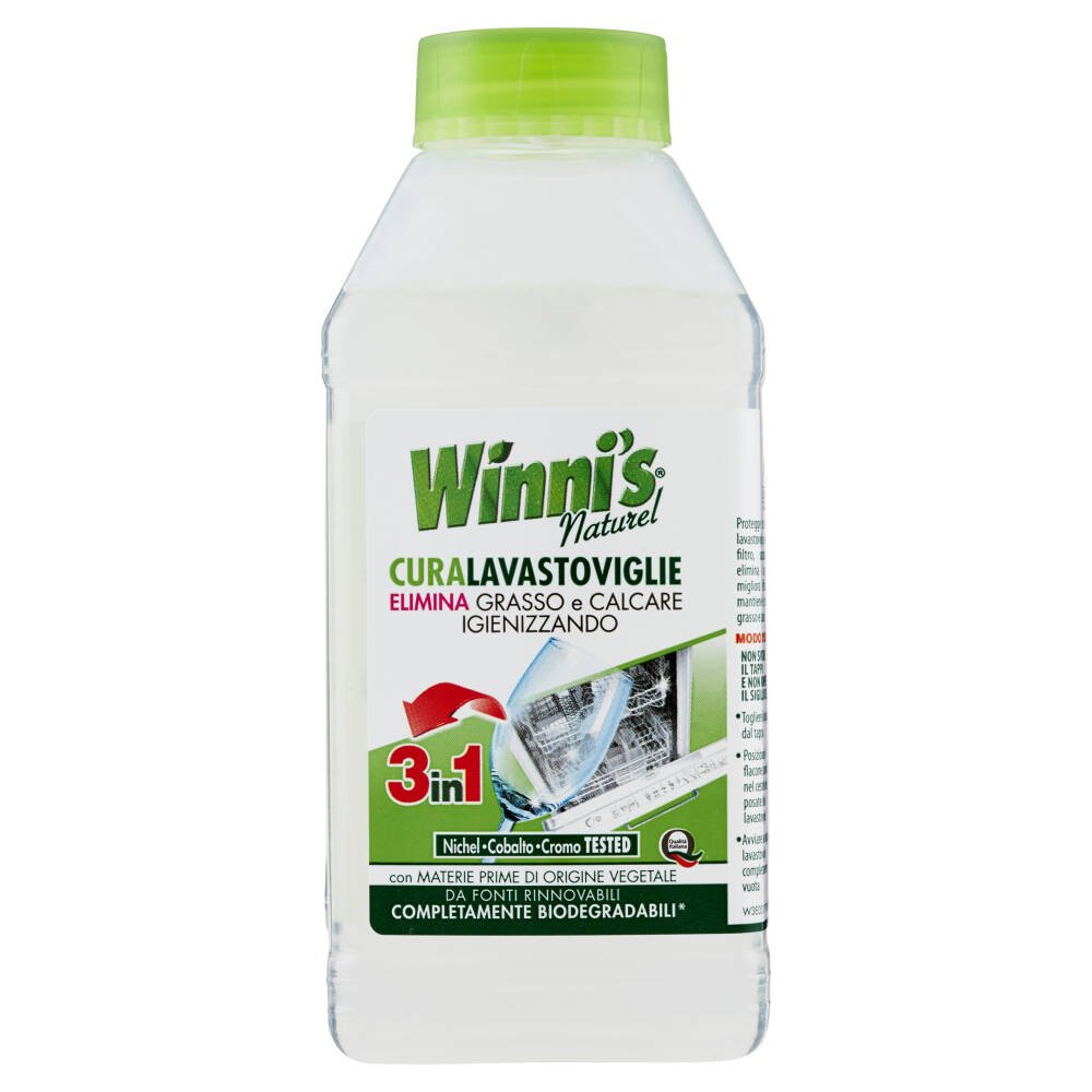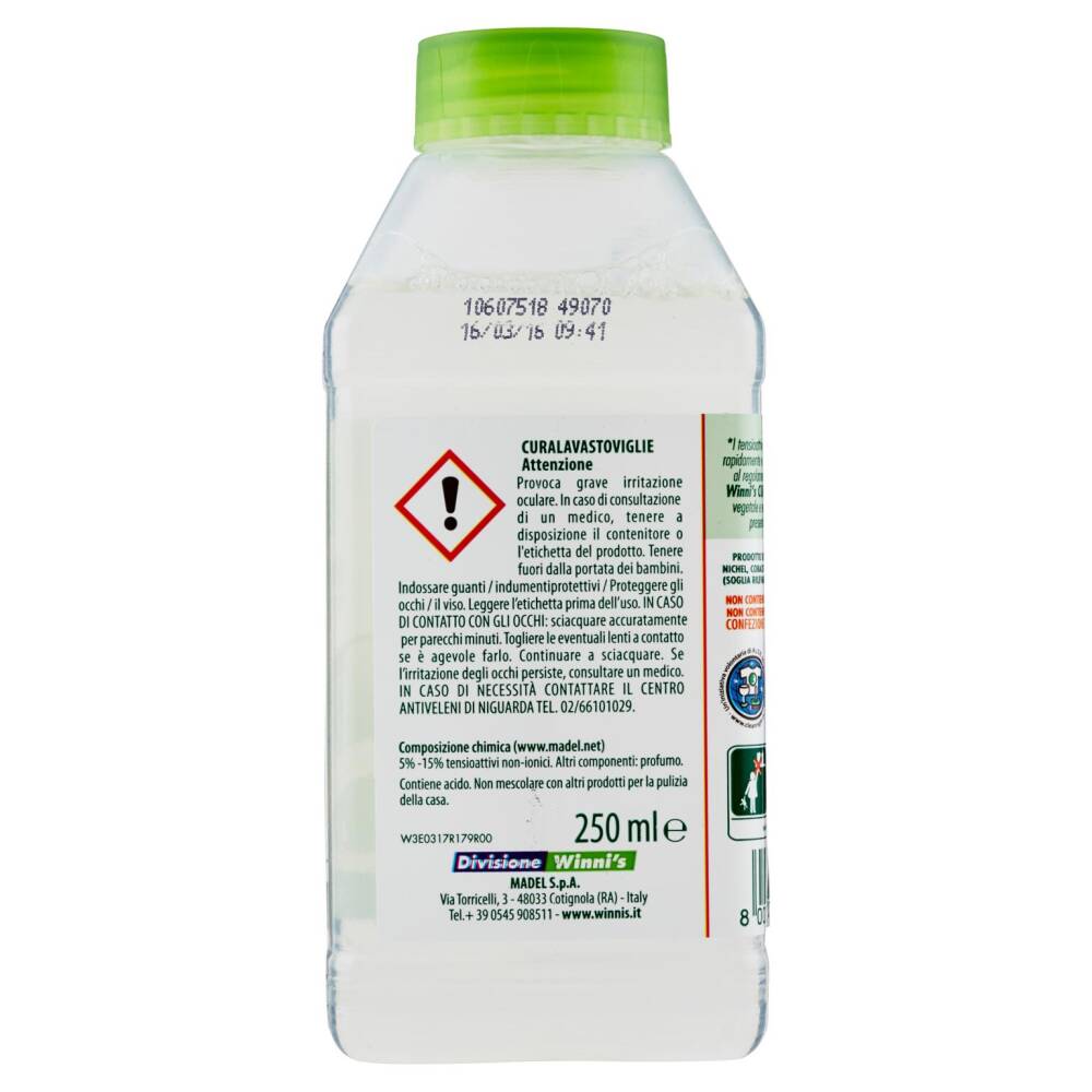 Econatura - A basso impatto ambientale Elimina grasso e calcare igienizzando Nichel - Cobalto - Cromo Tested Con materie prime di origine vegetale Da fonti rinnovabili completamente biodegradabili* *I tensioattivi presenti nel prodotto sono facilmente, rapidamente e completamente biodegradabili (in base al regolamento 648/2004/CE). I tensioattivi di Winni's Curalavastoviglie sono di origine vegetale e vengono trasformati dai microrganismi presenti nell'acqua in sostanze naturali.