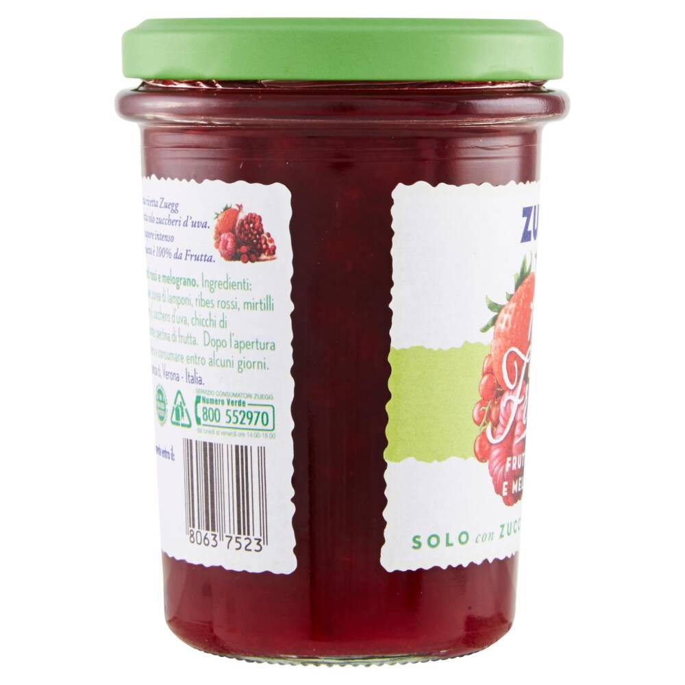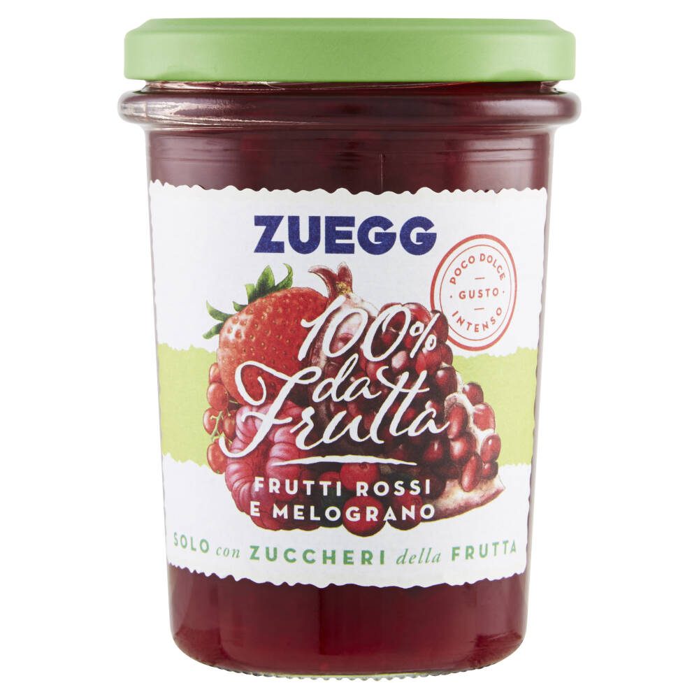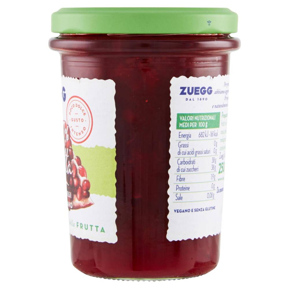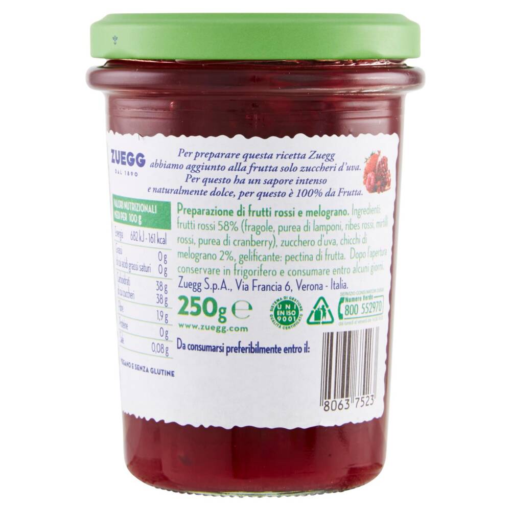 Frutti rossi 58% (fragole, purea di lamponi, ribes rossi, mirtilli rossi, purea di cranberry) Zucchero d'uva Chicchi di melograno 2% Gelificante: pectina di frutta