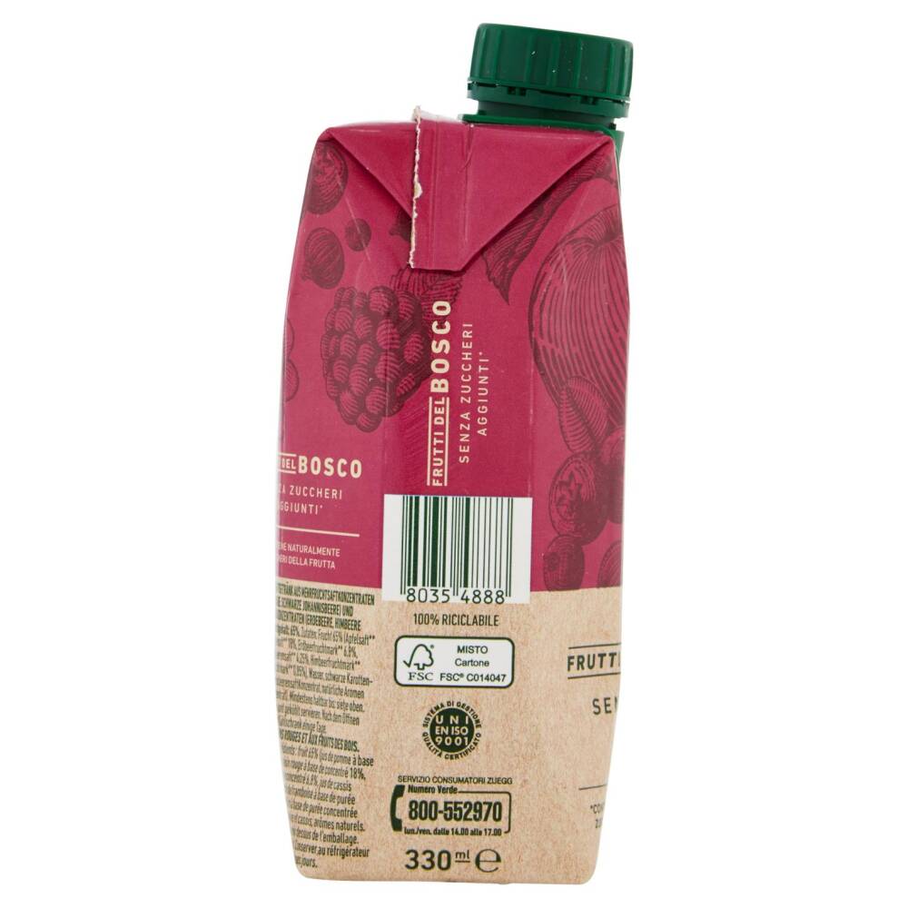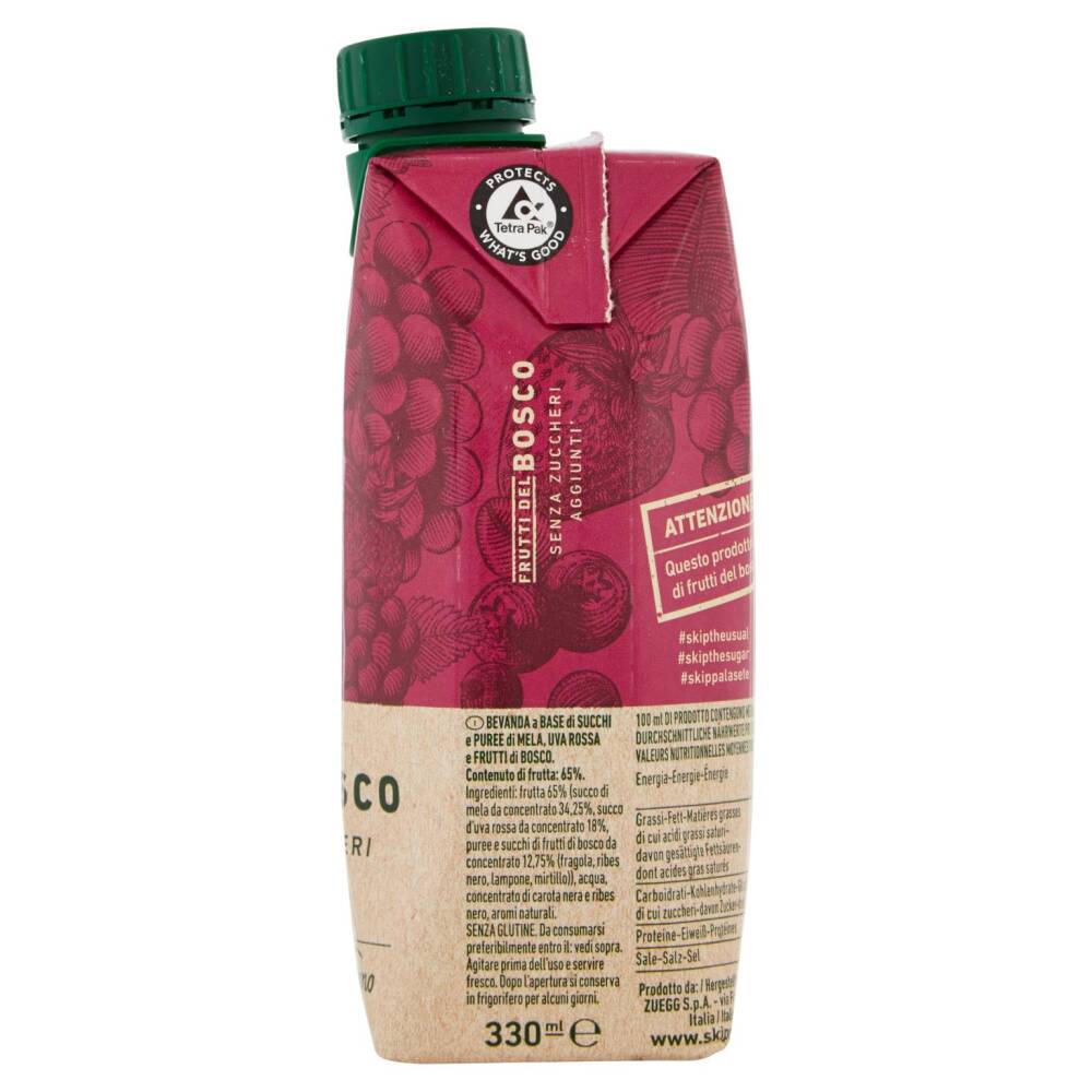 Frutta 65% (succo di mela da concentrato 34,25%, succo d'uva rossa da concentrato 18%, puree e succhi di frutti di bosco da concentrato 12,75% (fragola, ribes nero, lampone, mirtillo) Acqua Concentrato di carota nera e ribes nero Aromi naturali Senza glutine