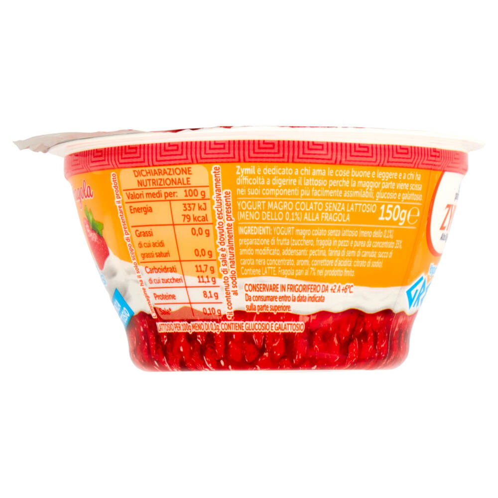 Yogurt magro colato senza lattosio (meno dello 0,1%) Preparazione di frutta (zucchero, fragola in pezzi e purea da concentrato 35% amido modificato, addensanti: pectina, farina di semi di carruba; succo di carota nera concentrato, aromi, correttore d'acidità: citrato di sodio) Contiene latte Fragola pari al 7% nel prodotto finito